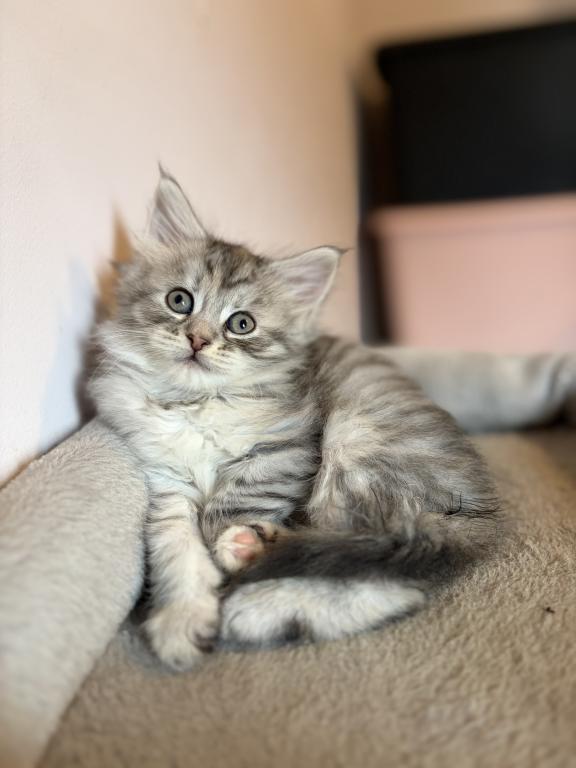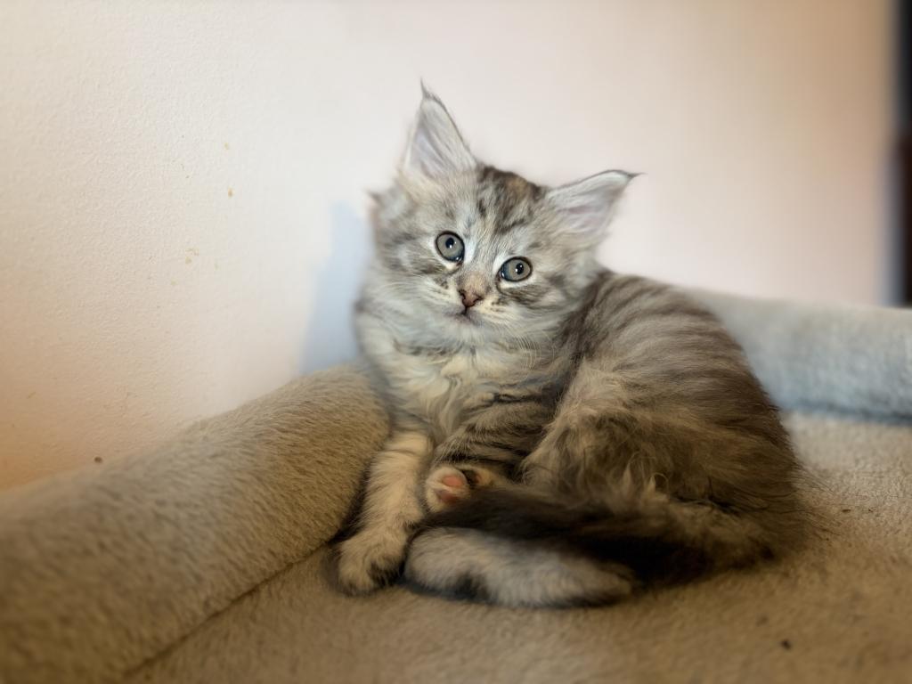 This sweet baby is a silver tortie. She has a small red spot on the top of her head which makes her unique. She is very friendly and playful. Please reach out for more information, pictures and videos of this sweet girl.