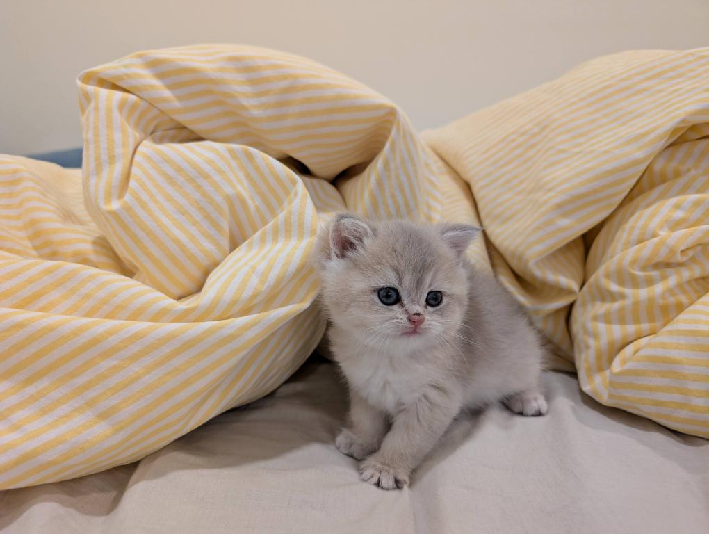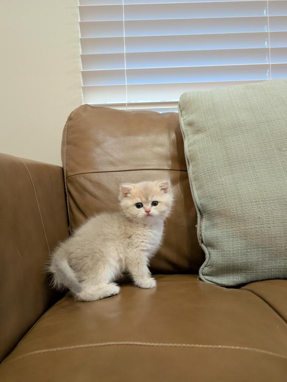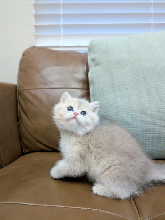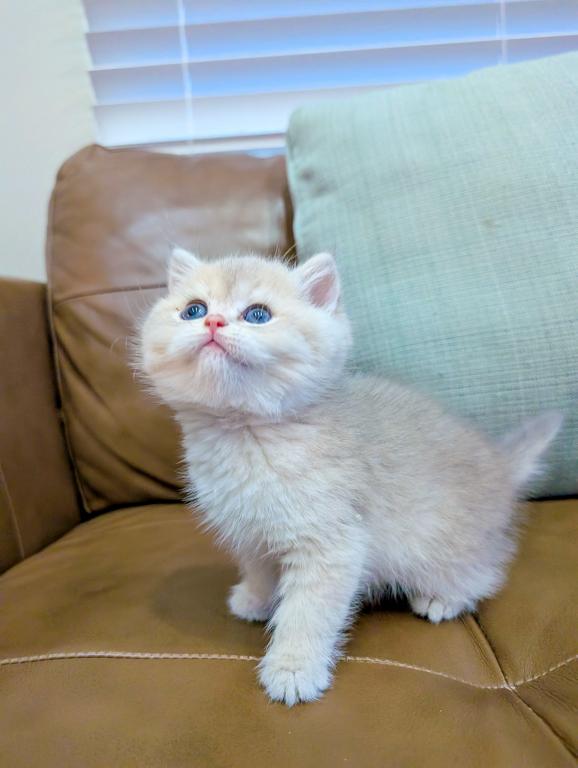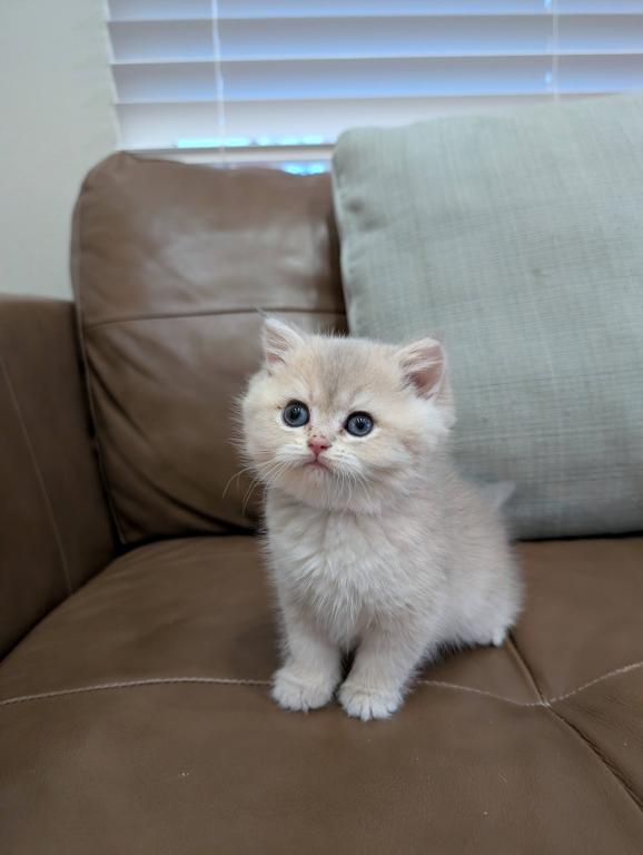 Blue Golden Chinchilla British Shorthair Kitten - This sweet and playful kitten has been lovingly home-raised with constant care. Both parents are on-site and available to meet. She comes fully litter-box trained, dewormed, and vaccinated. A pretty, perfect, and healthy addition to a loving home.