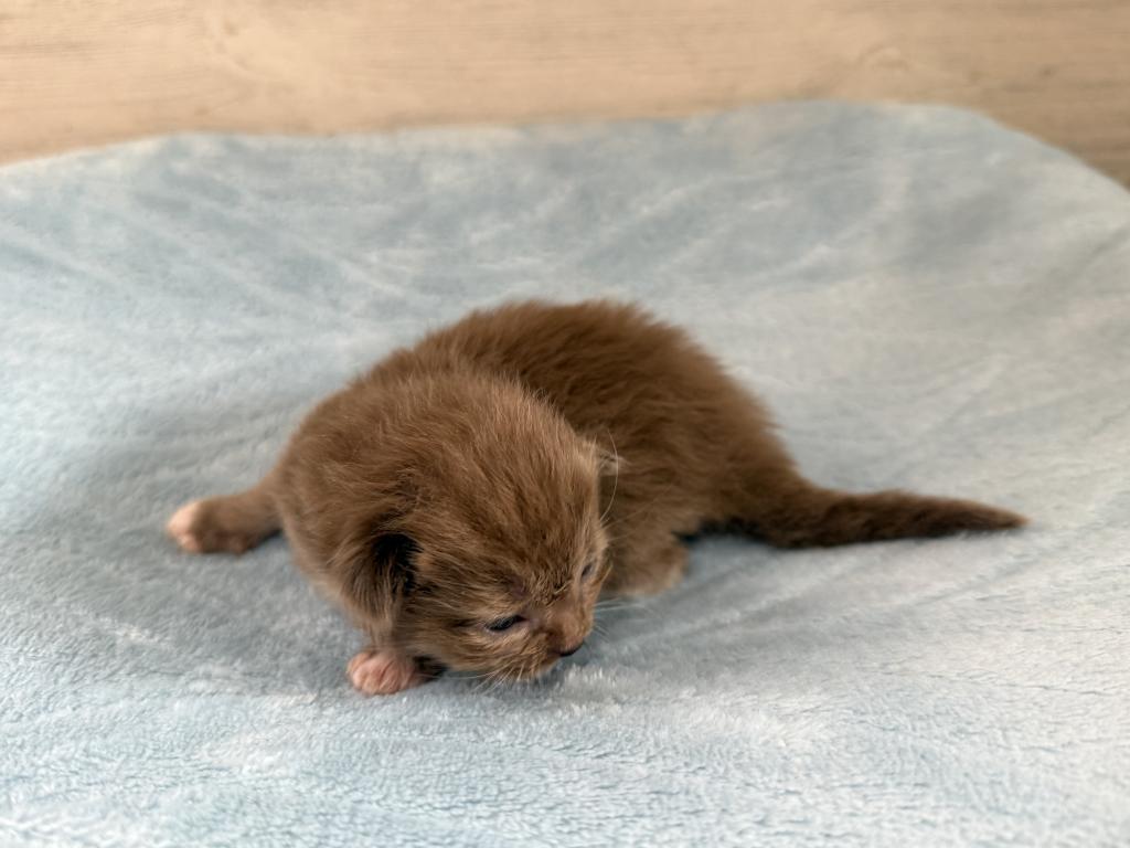 His mom is a solid cinnamon and dad is a blue mink mitted. Born March 31 he will be 12 weeks and ready for his new home June 23.