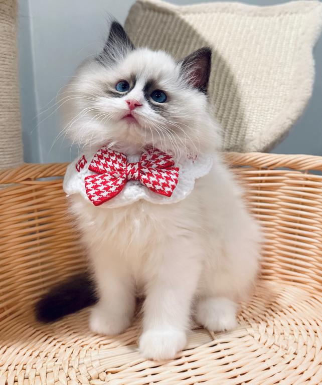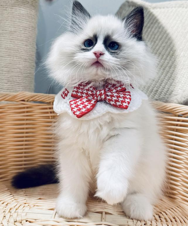 He is a Seal Bicolor Ragdoll . He’s very playful and outgoing kitten. Loves kids and other cats .