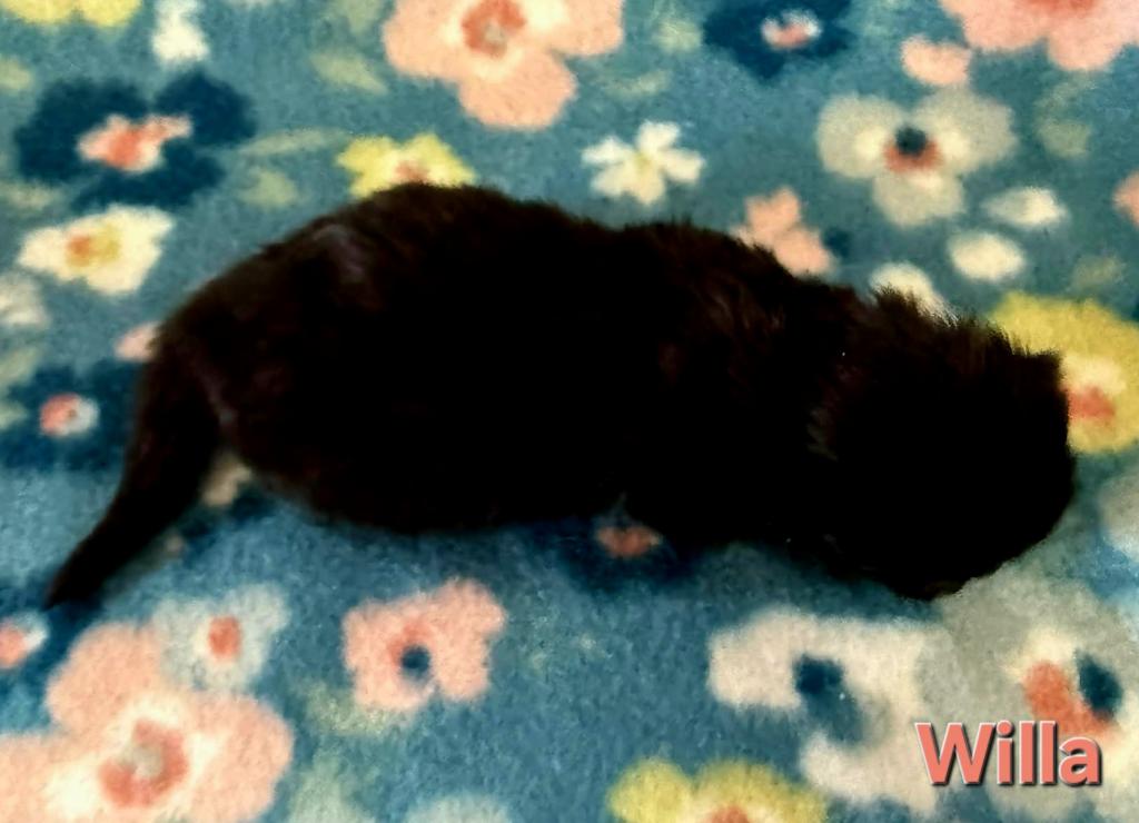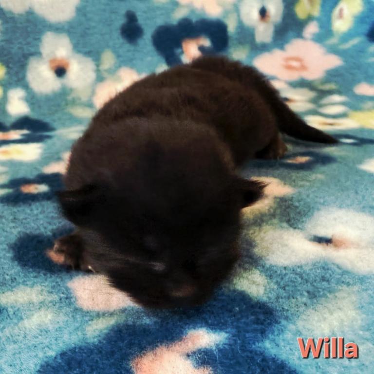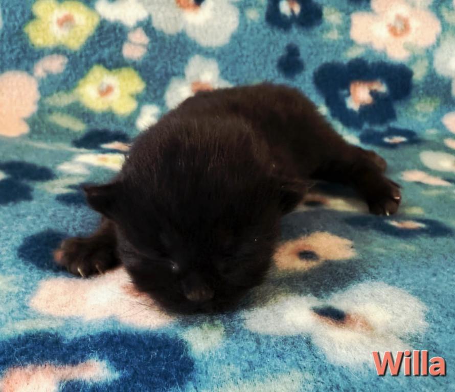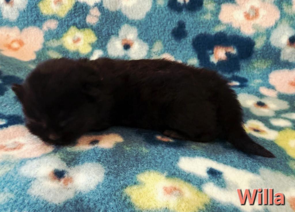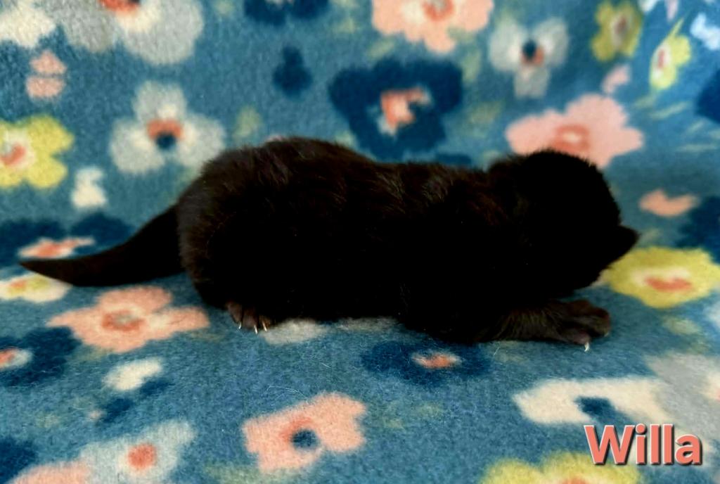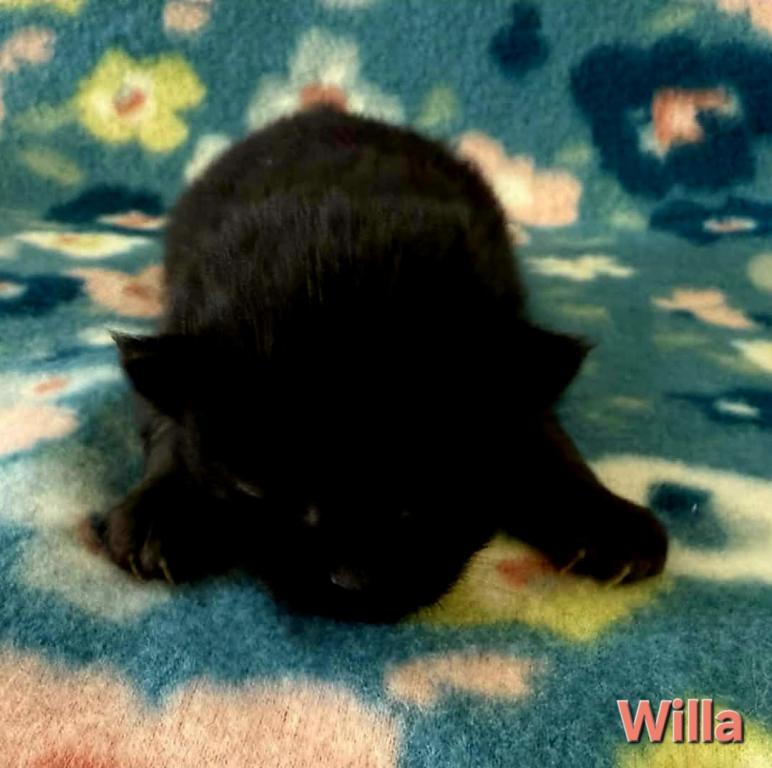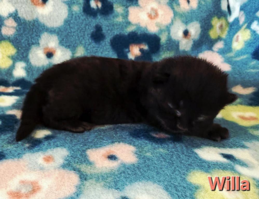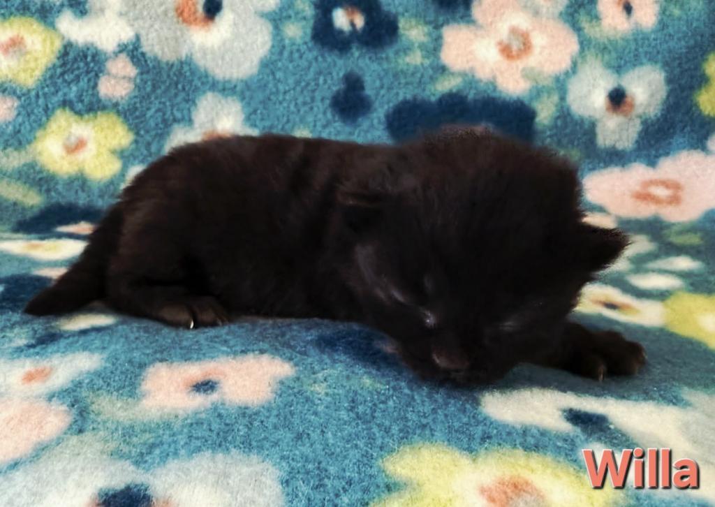Willa is a beautiful black kitten. Siberians are a great choice for those with allergies. The parents from the litter are imported from Russia. Our kittens are raised indoors, as members of our family and are very socialized, litter trained, etc