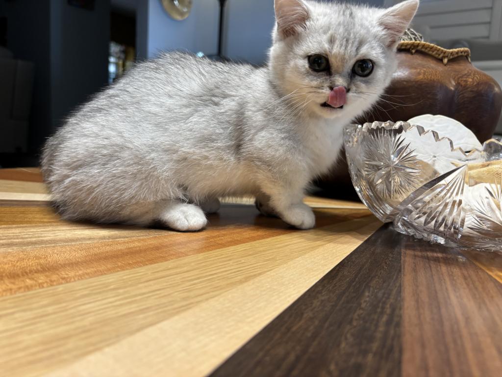 Kevin is a Beautiful Silver blue shaded male munchkin kitten. He is active and healthy and playful with age appropriate shots and deworming. He is well socialized and loves his lap time and cuddles. He is neutered microchipped and vaccinated and will come with a carrier and sample of food. He is also litter box and scratch pad trained. All of my kitties are TICA registered and pedigreed and are guaranteed to arrive heathy and have a 1 year guarantee against congenial malformations. For more information or to make Patch part of your family today please contact me or visit my website at www.tmzkittenznkatz.com.