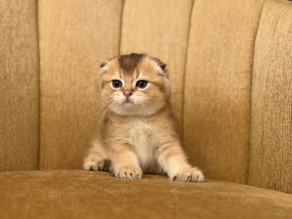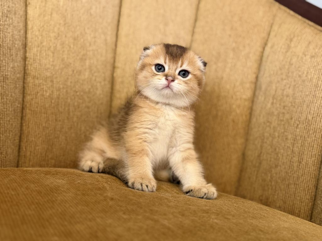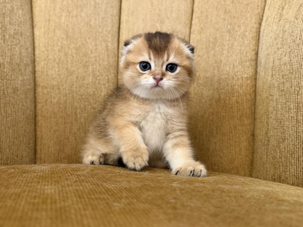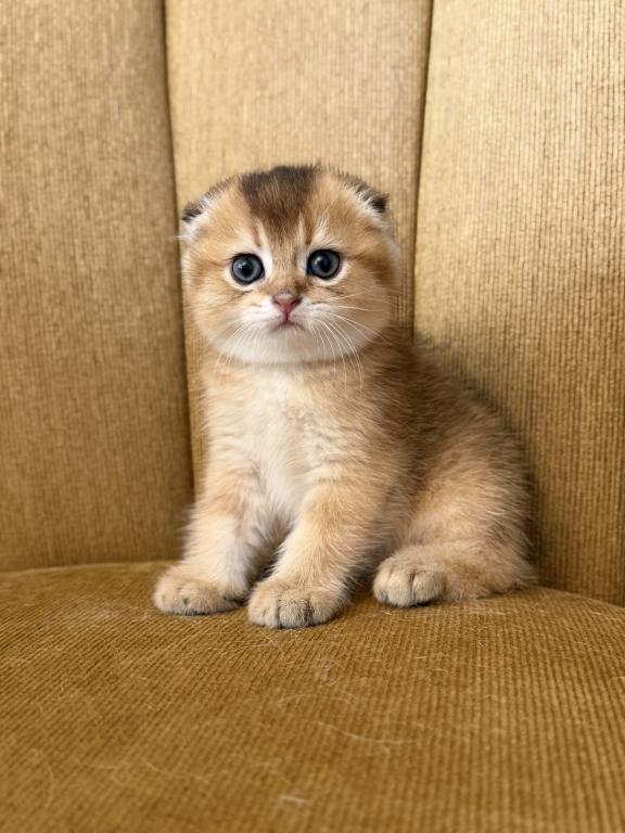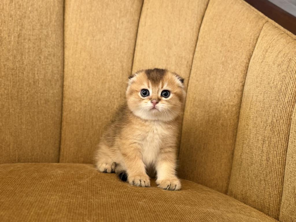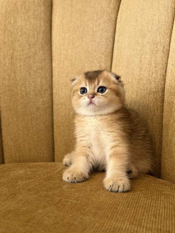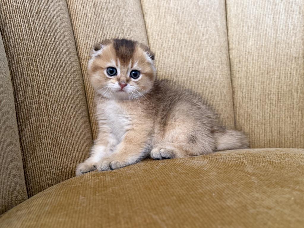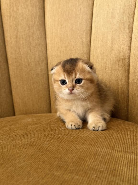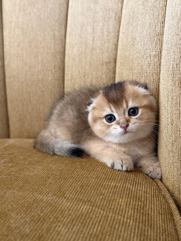 Beautiful Scottish Fold girl with a gorgeous golden shaded coat. She has a round face, small folded ears, big expressive eyes, and a very calm, sweet personality. Raised at home with love and care, she is very socialized and used to people. She will come with a full veterinary exam, first vaccinations, deworming, and Florida Health Certificate. She is growing in a clean family environment and will be ready for her new loving home soon.