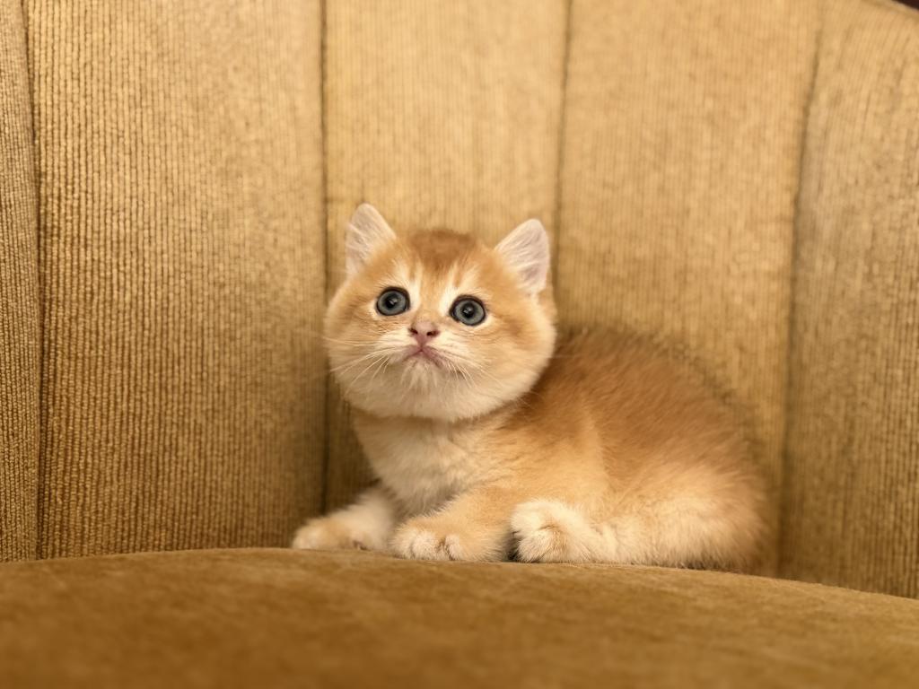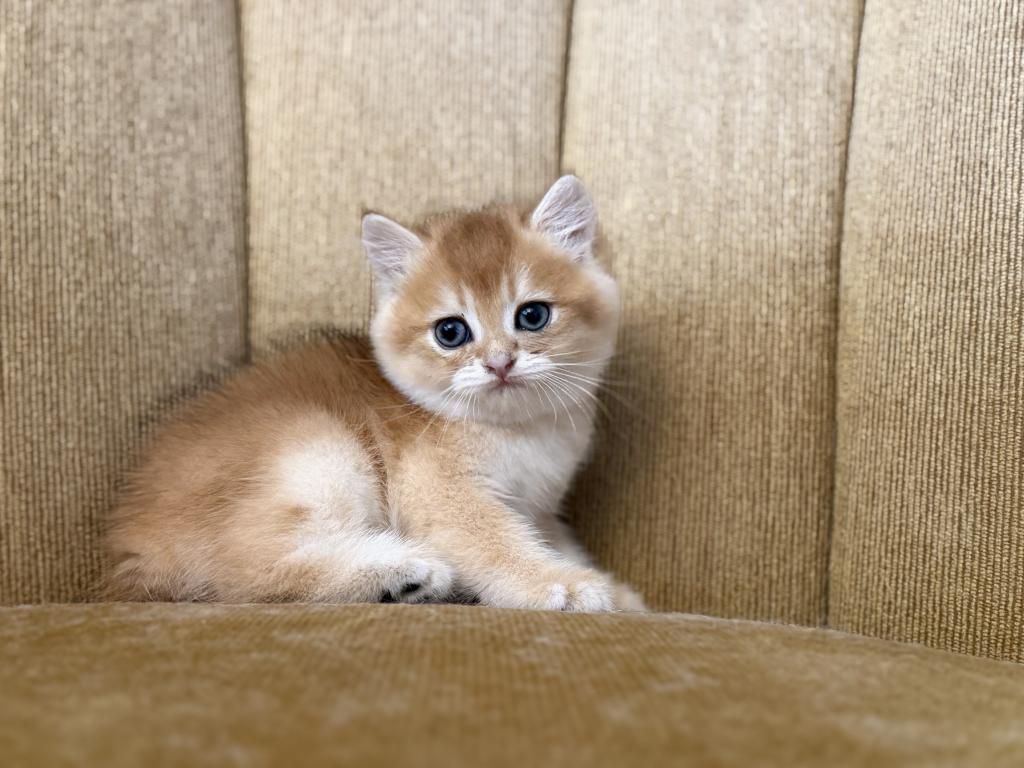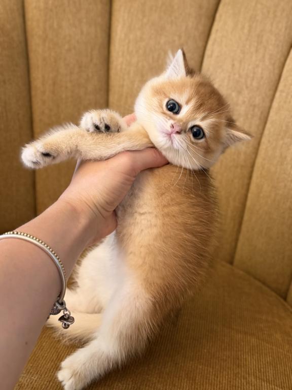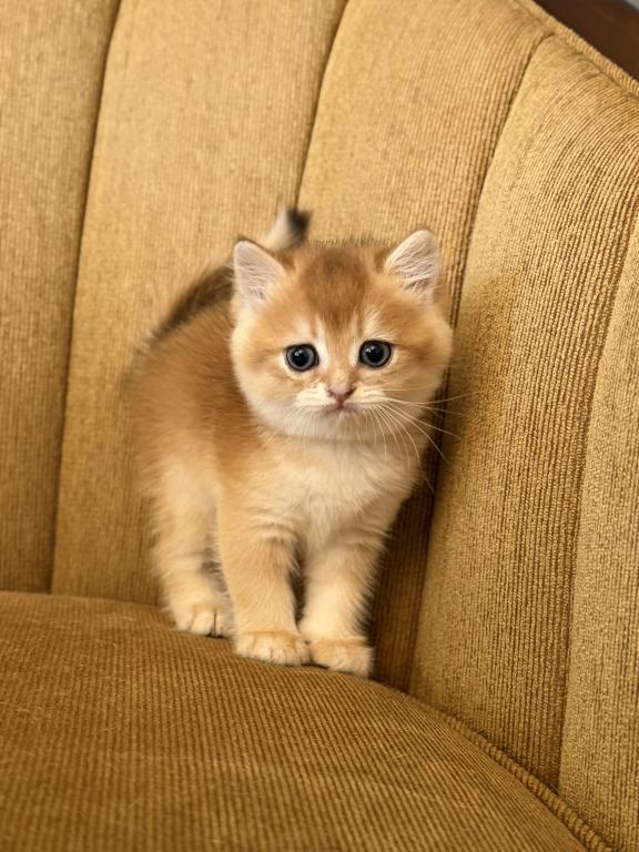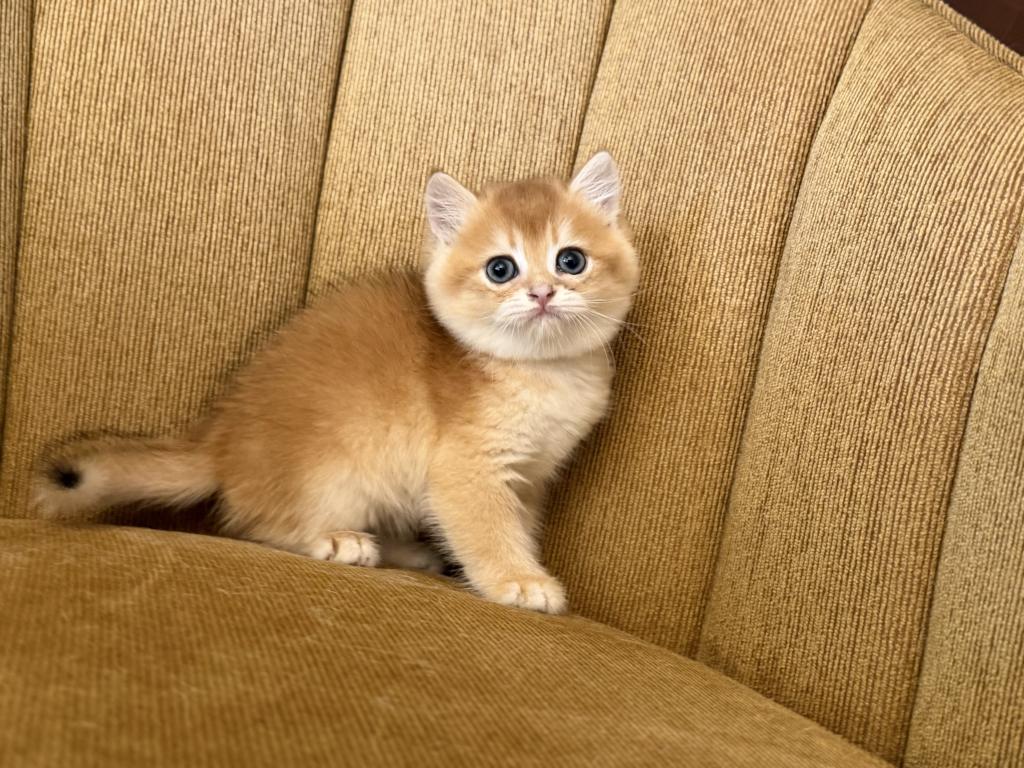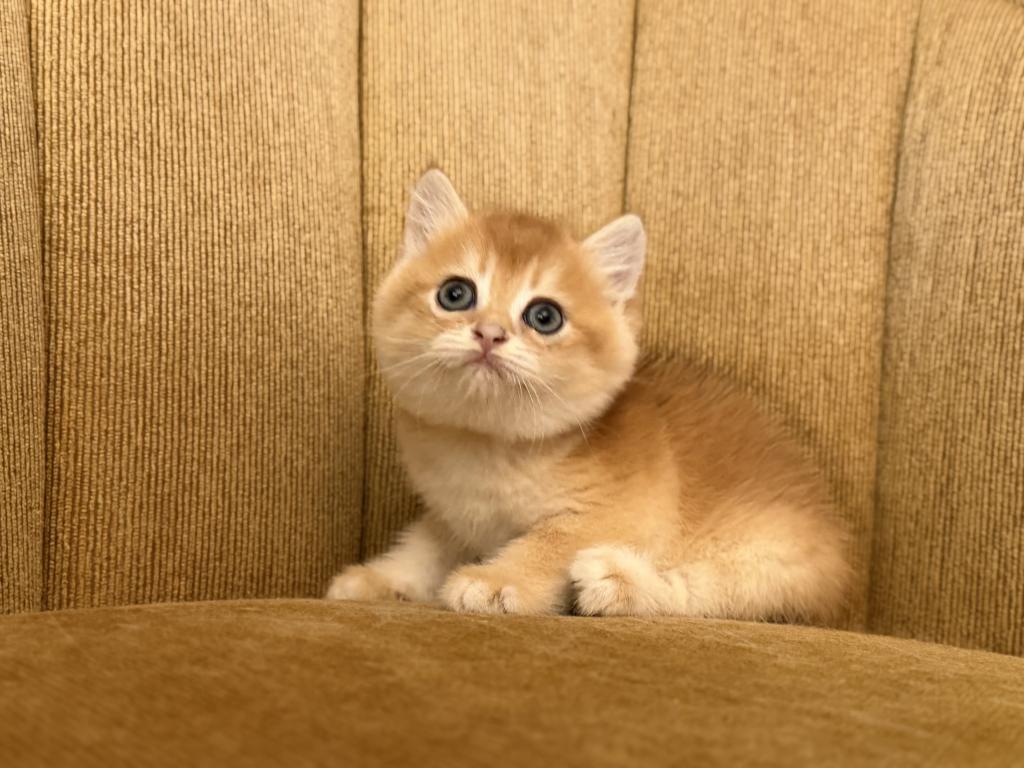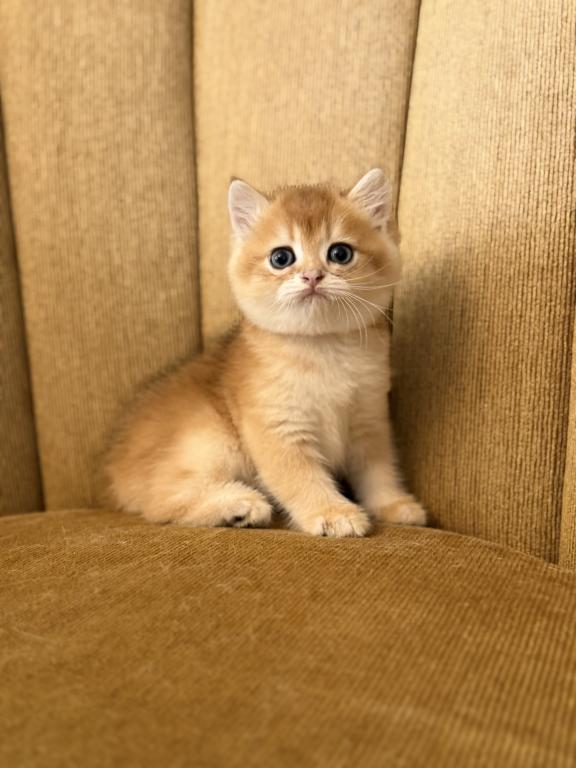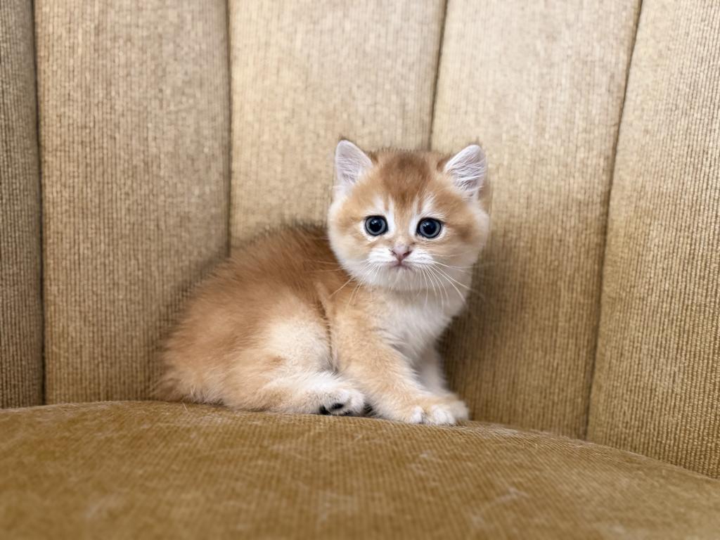 Male Scottish Straight kitten with a beautiful golden shaded coat and bright blue eyes. Very sweet, calm, and affectionate personality. Raised at home with lots of love and daily human interaction, well-socialized and used to household environment. He will come with age-appropriate vaccinations, full health check, and Florida Health Certificate.
