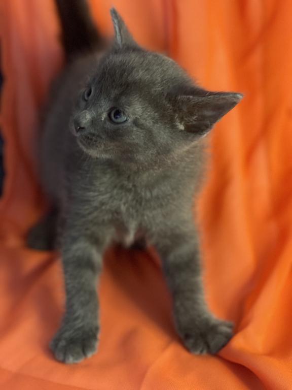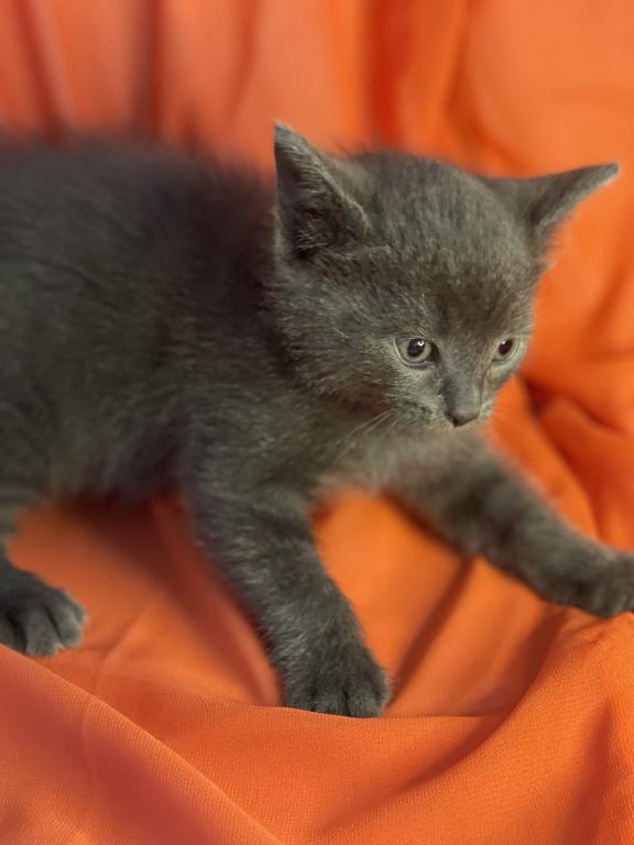 Russian Blue kitten, male. Very active, playful and smart kitty. Litter box trained. Never been caged. Eating cans, dry food. Available May 5. 847-714-3890