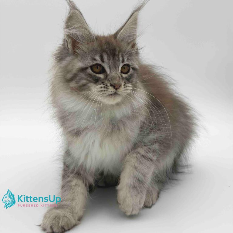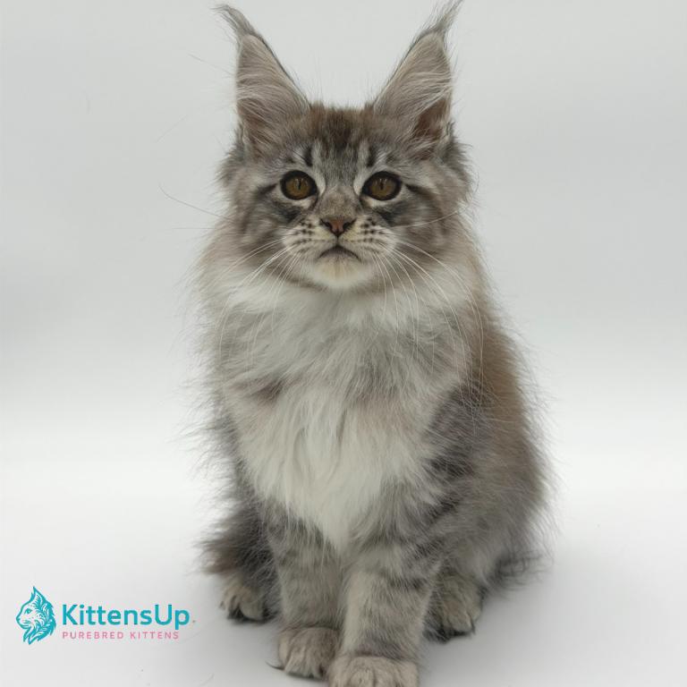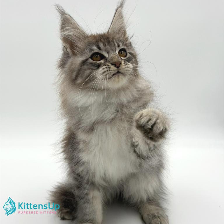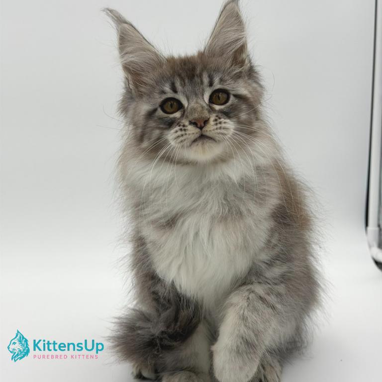Meet Katu, a stunning Maine Coon kitten with a striking coat. This kitten has the signature large build, fluffy coat, and playful personality that makes the Maine Coon one of the most popular and beloved cat breeds in the world.
