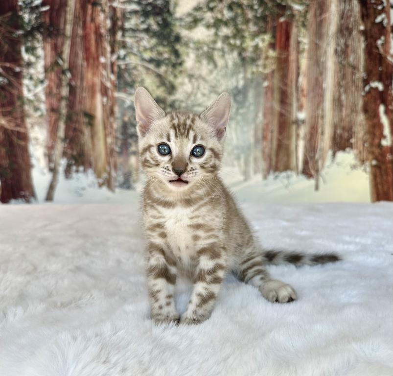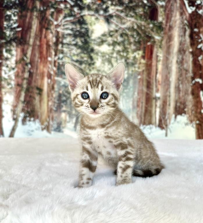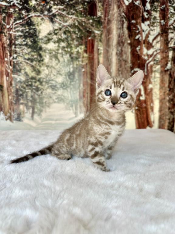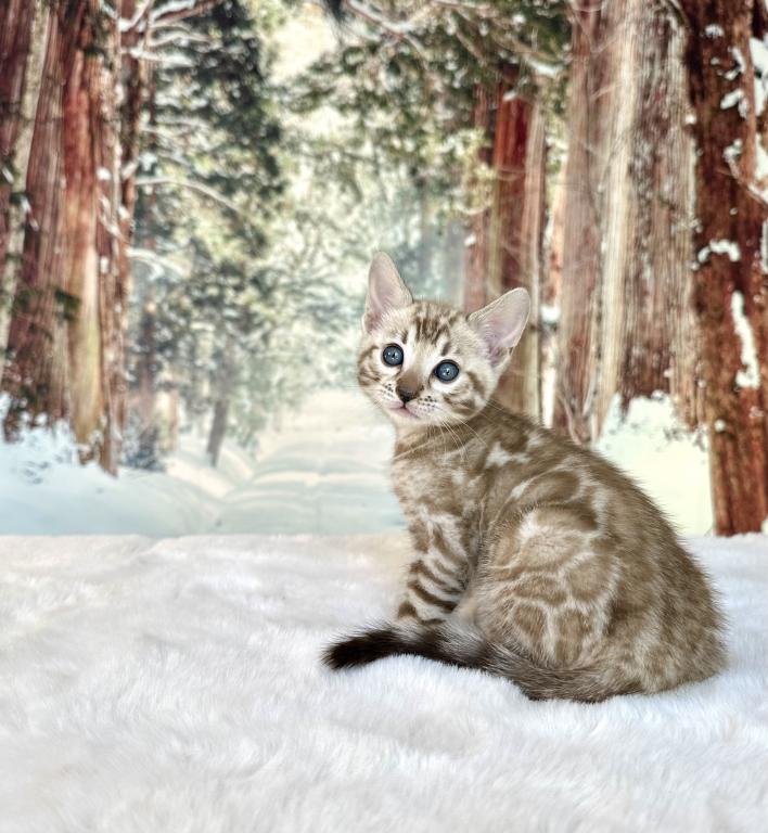 Playful and loving girl. Shes the biggest out of a litter of 4. Gorgeous large rosettes and beautiful blue/aqua eyes.