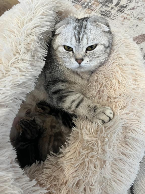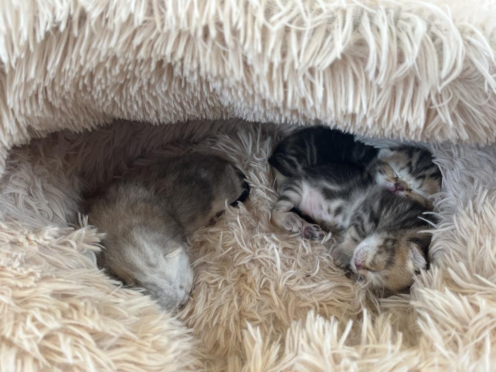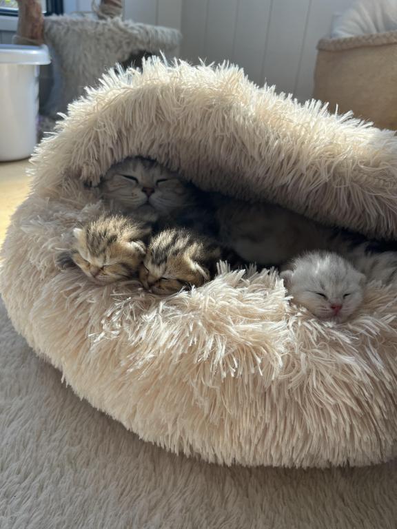 Around 3–4 weeks of age, we will begin to see whether their ears develop as folded or straight (Scottish Straight), and this will be updated for each kitten.