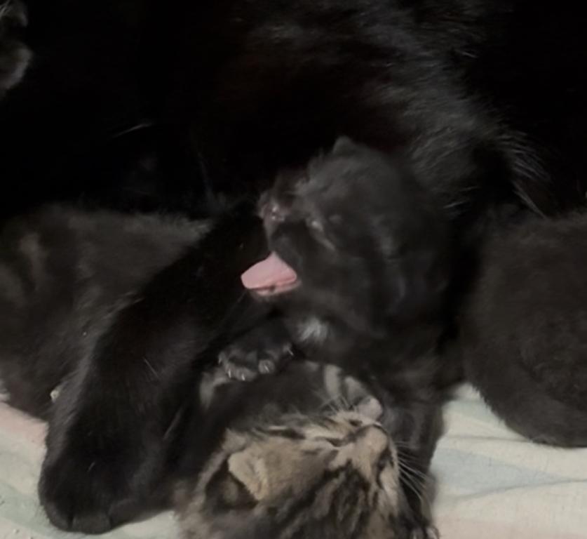 Topaz is the shorthair daughter of an unpapered Maine Coon and is herself a polydactyl. She is a clever, slighty naughty girl who very much enjoys getting to live in the kitten room (with its plentiful food, sunny windows, and frequent lovings) while she raises a litter. She's high energy, though, and prefers the outdoors when she isn't being a mama! She has 4 little girls in this litter. This listing is for Petunia, her black normal-toe daughter. At 10 days old, Petunia is noticeably larger than her classic tabby sisters (similar in size to her black polydactyl sister, Lavender). She is a happy baby who is content to be held, happier to nurse. She does not startle easily or show fearfulness, but she is talkative and more prone to exploring. More on her personality as it develops. ———————-—————- Petunia is $40, and her polydactyl sisters are $250 each. All monies collected are used to care for the cats of our private sanctuary. Donations are welcome. —————————— If you live too far away to drive to us, I am willing to do the 150 mile round trip to meet you at the Green Bay airport, but I do ask for an additional $50 donation to our private sanctuary to cover time and expenses. It makes no sense for you to spend 4x that to rent a car and come to us!