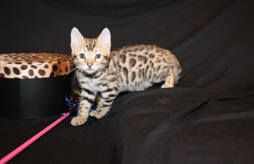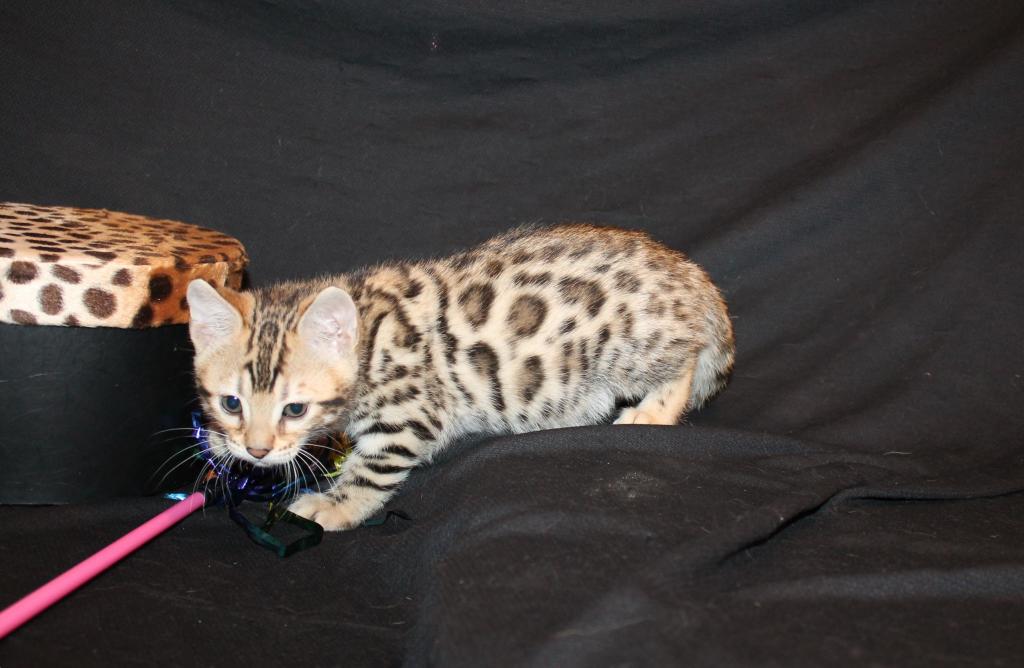 "Valentina" was born on Valentines day. She has a clear yellow/gold coat color with a leopard rosetted pattern. Super playful. She will be spayed and ready to go early May.