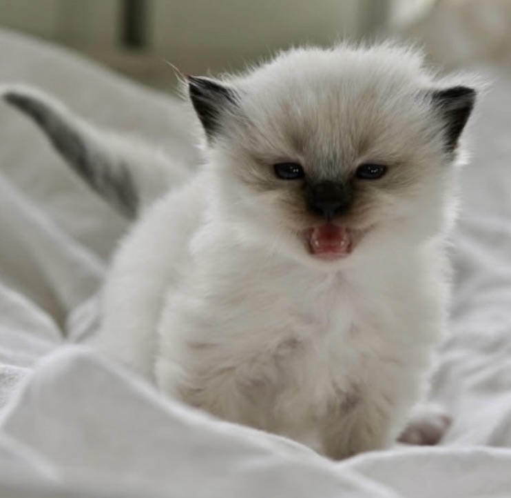 Honey is a sweet and chubby mitted seal point ragdoll. She craves attention and pats, always running up to her humans to say hello! She loves playing and snuggling with her humans and siblings. Honey is best kept inside the house but will enjoy catching some fresh air in a enclosed outdoor area or catio. Honey will be ready to go to her new home in mid May. Honey has a super duper sweet and affectionate mitted seal mommy named Echo and an extra floppy, sweet and mushy blue bicolor daddy named Blue. Blue has a polish mother and a Turkish father.
