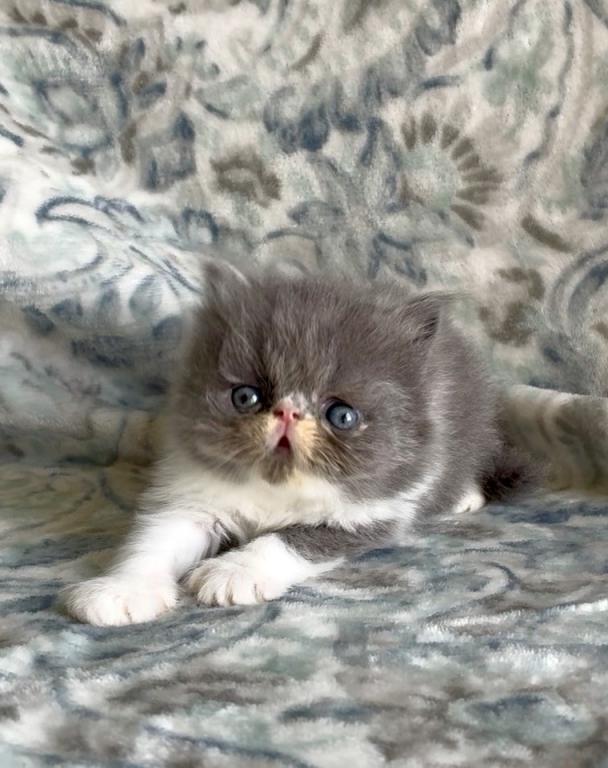 This little blue and white boy is a furry ball of fun and curiosity. He will be a wonderful addition to somebody's home. His mother is a beautiful lilac calico and his dad is a solid black big-eyed Persian.