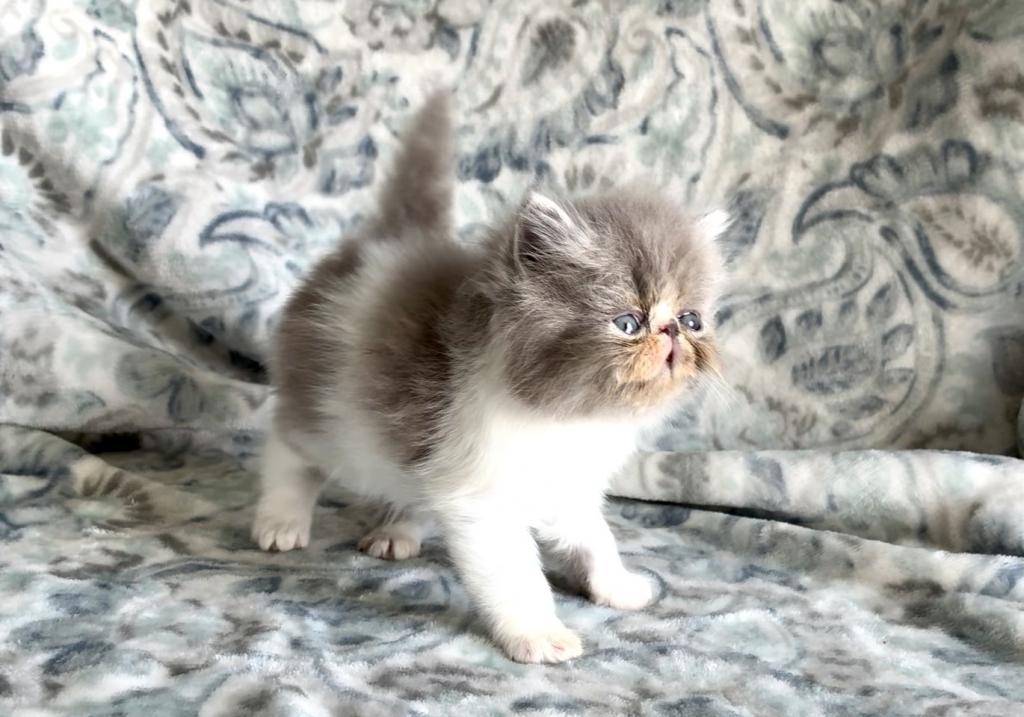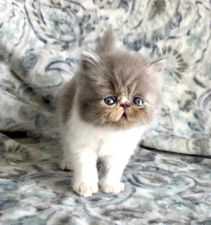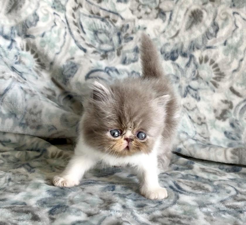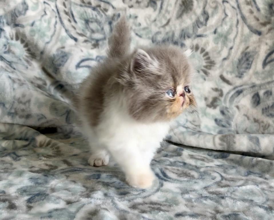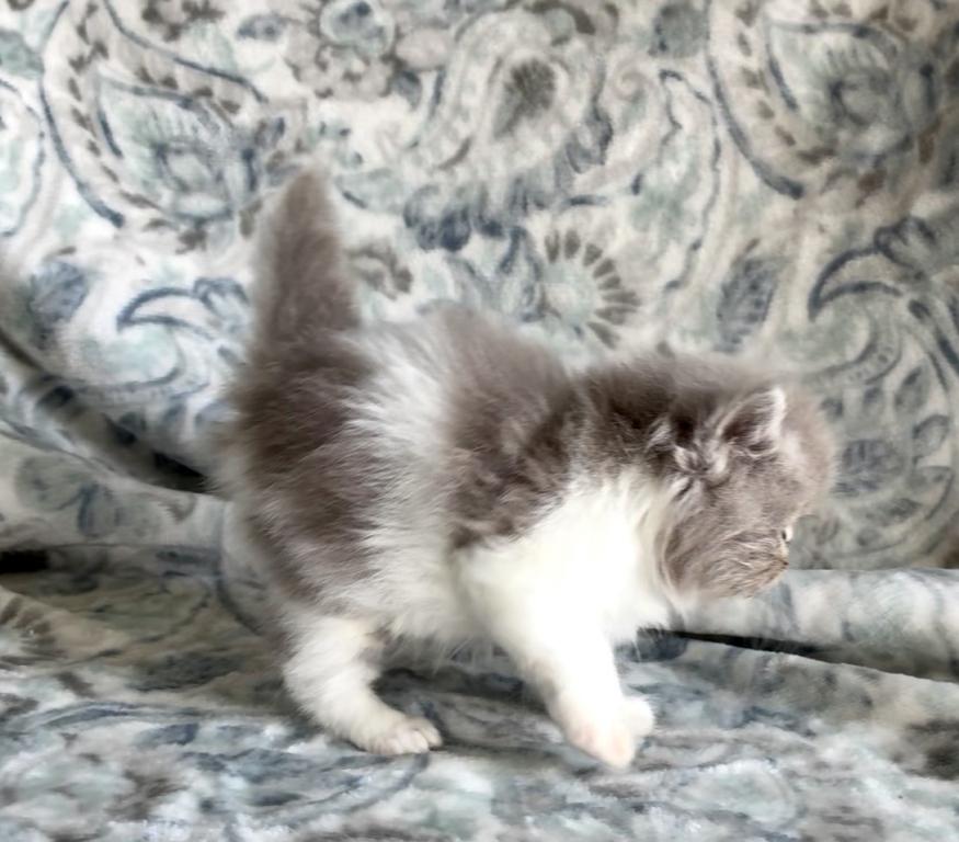 This lilac and white boy boy is sunshine in a kitten. He is sweet and playful and a ball of furry happiness. His mom is lilac and white like he is, the most affectionate cat we have, and his father is equally as happy and cuddly. He is a red and white that carries chocolate. This little boy would make a wonderful pet or even the possibility of a beautiful king for an approved cattery.