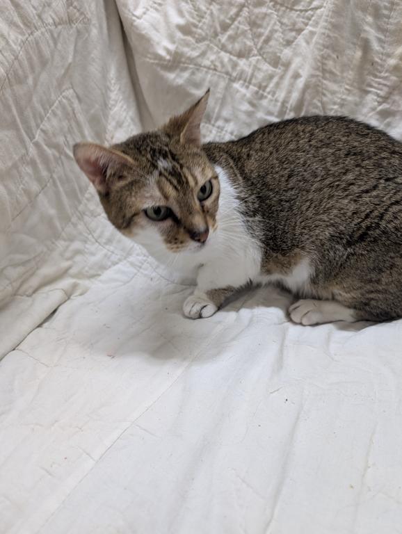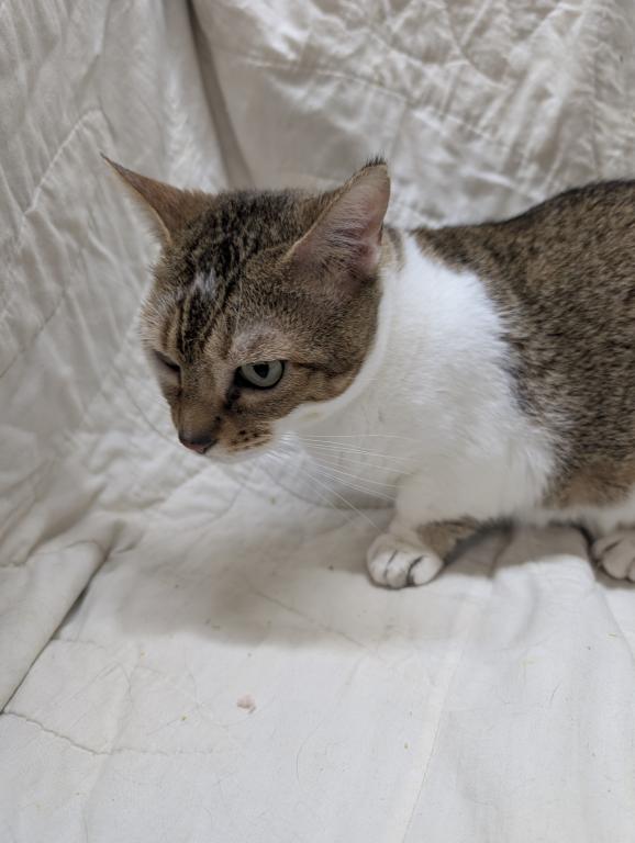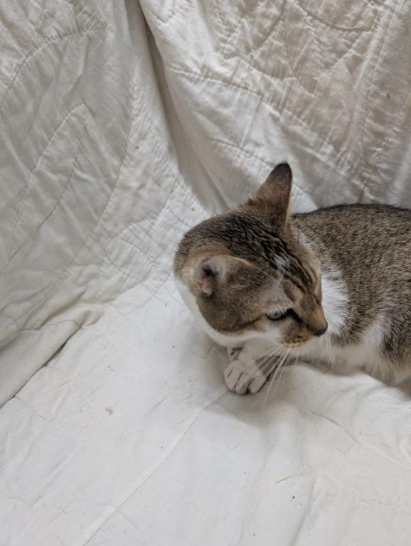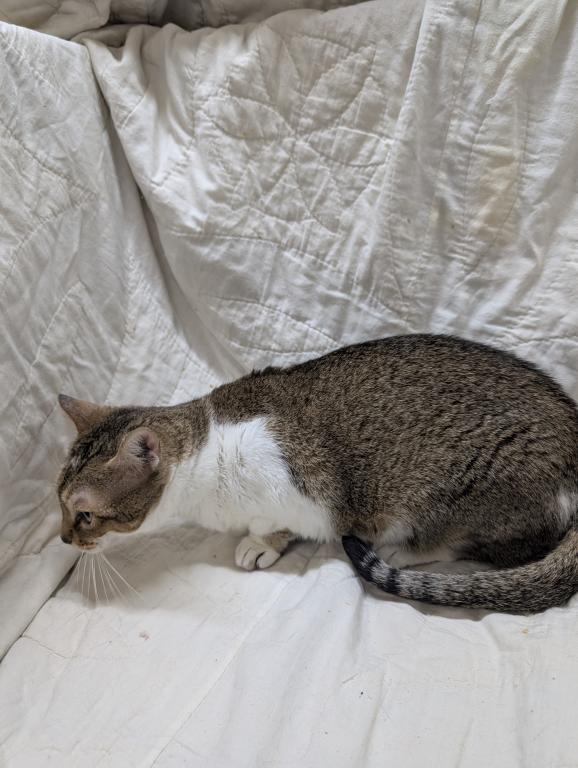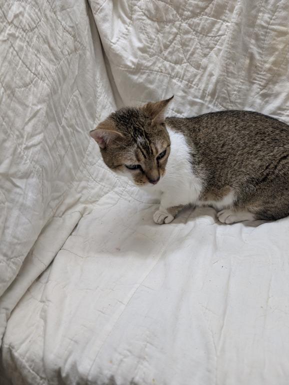 She's a calm adult female who would make a great lap cat for someone. Likes kids and teenagers and adults. Does okay with dogs and another 1 or 2 calm cats. She's not extremely active. Litter box trained. Free to a forever family. She has very short rug hugger munchkin legs and doesn't climb.