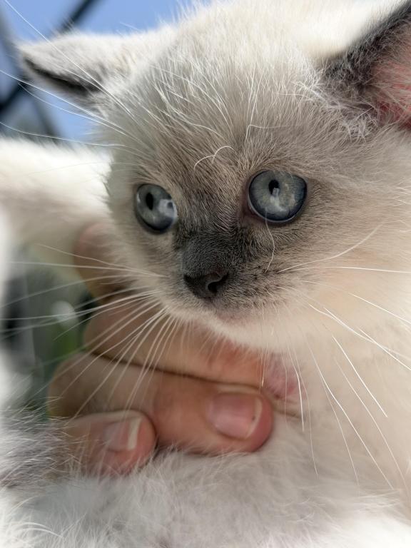 Cloud has a really cute personality. While not the biggest girl in the litter, she definitely asserts herself with her siblings and is super playful. She is mitted with beautiful blue colorpoints.