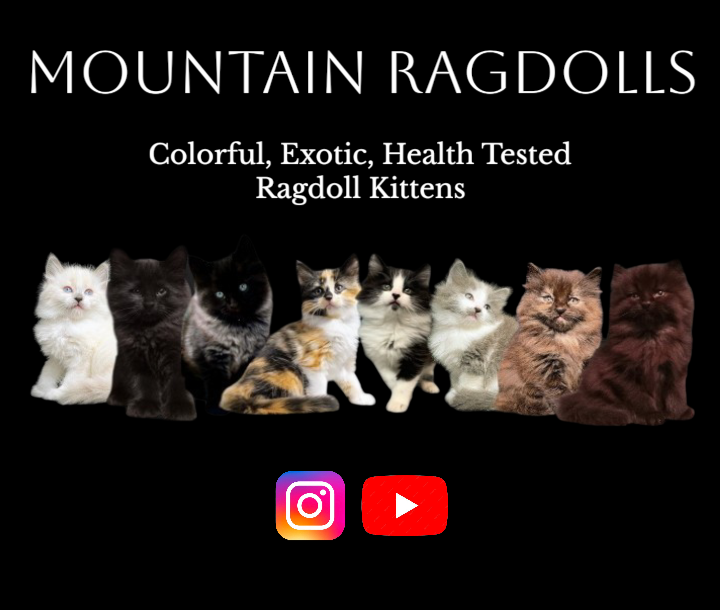 *I am a natural Breeder of colorful and exotic Ragdoll kittens. *Colors we produce are- Black, Smoke Black, Chocolate, Tortie, Calico, Orange Tabby,Black Tux, Pointed, and Solids. * Multi-Generational, Non-Medicated, Chemical Free DNA. Bred to better a species throught the elimination of Vaccinosis. *Each kitten will have its own health test performed. *Genetics Tested. *Litter trained. *Raised indoors with children, adults, large dogs, and older cats. *Raising kittens for 20+ years. *No controlling contract. *No deposit required. Pay and pick up is in person. *Bred for health, temperament, and beauty. *Watch us on YouTube @ Mountain Ragdolls. *Find us on Instagram @ Mountain Ragdolls. *Located in the beautiful Sierra Nevada Mountains of Northern California.