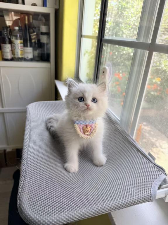 He has stunning blue eyes, a soft fluffy coat, and that classic sweet Ragdoll expression.