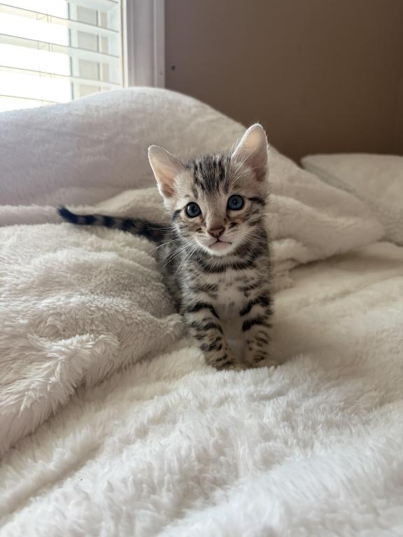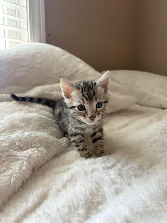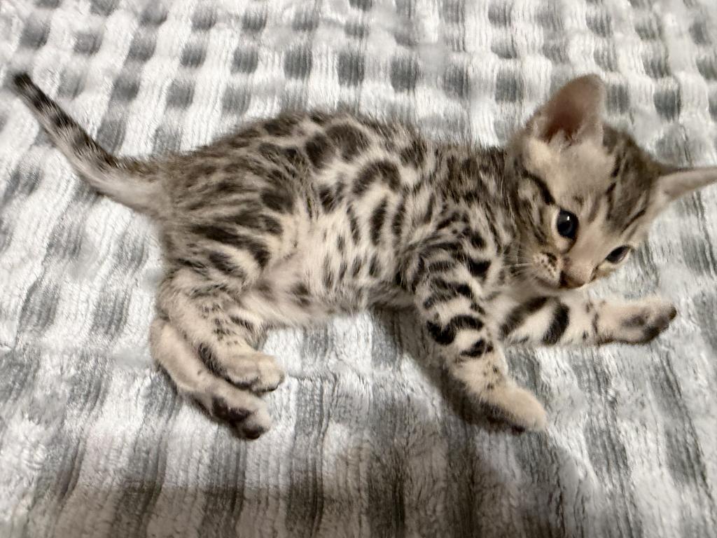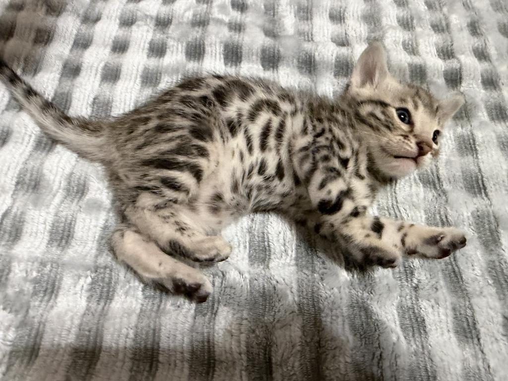 This amazing Silver Bengal boy is very playful and cuddly. This little explorer is really curious, and he loves humans company. He has beautifully arranged rosettes on his body.