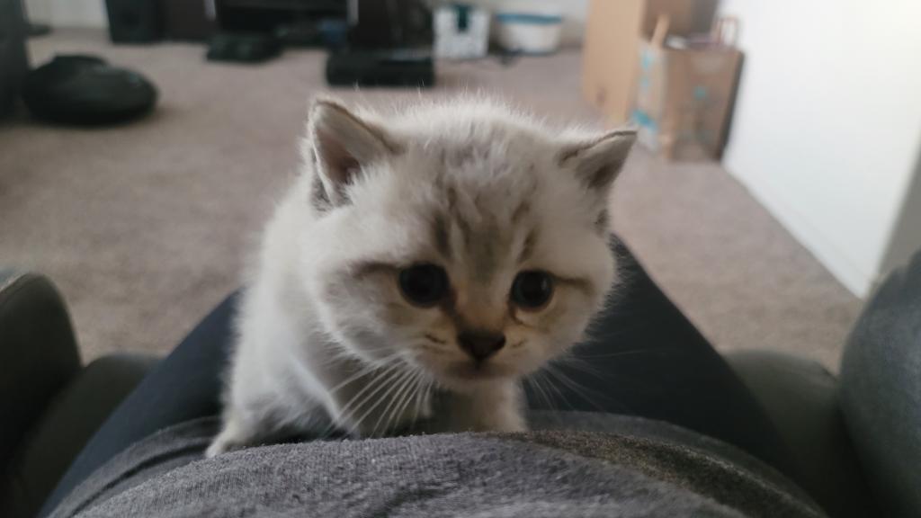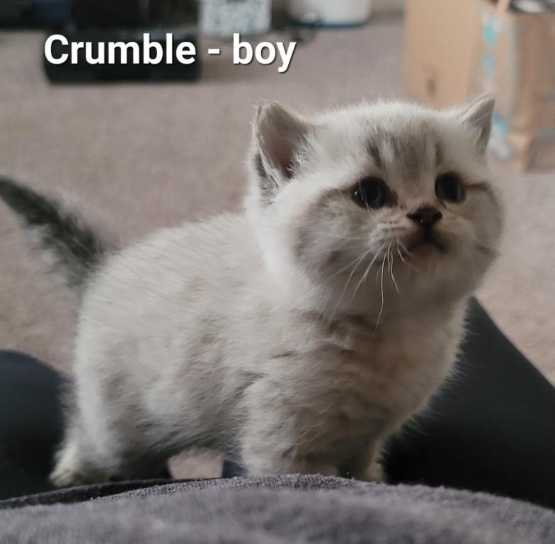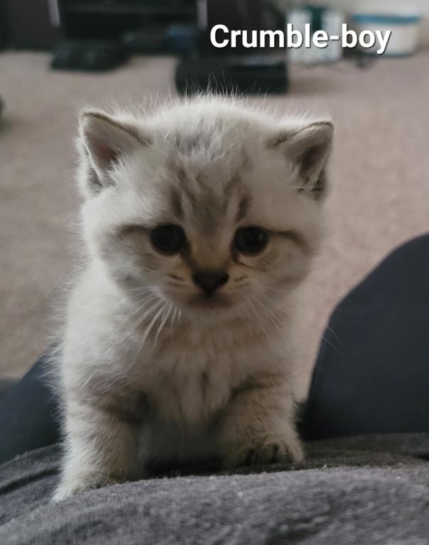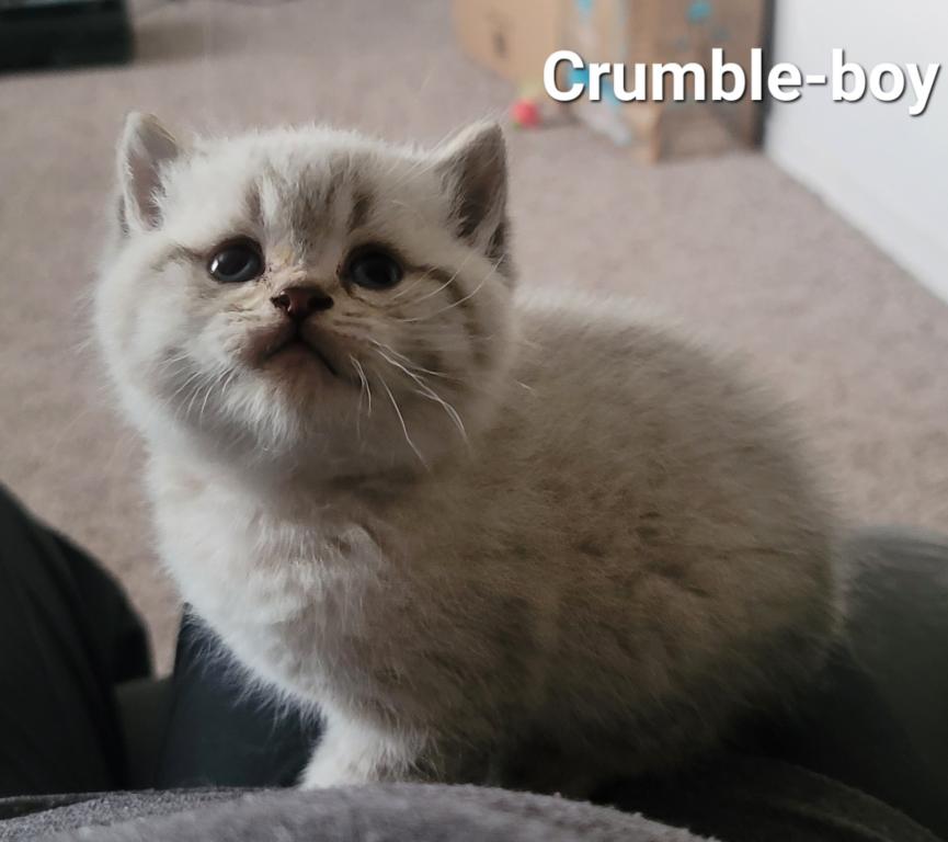 Crumble is a beautiful Scottish Straight kitten. He is healthy and well-socialized. He comes with first shots and dewormers.