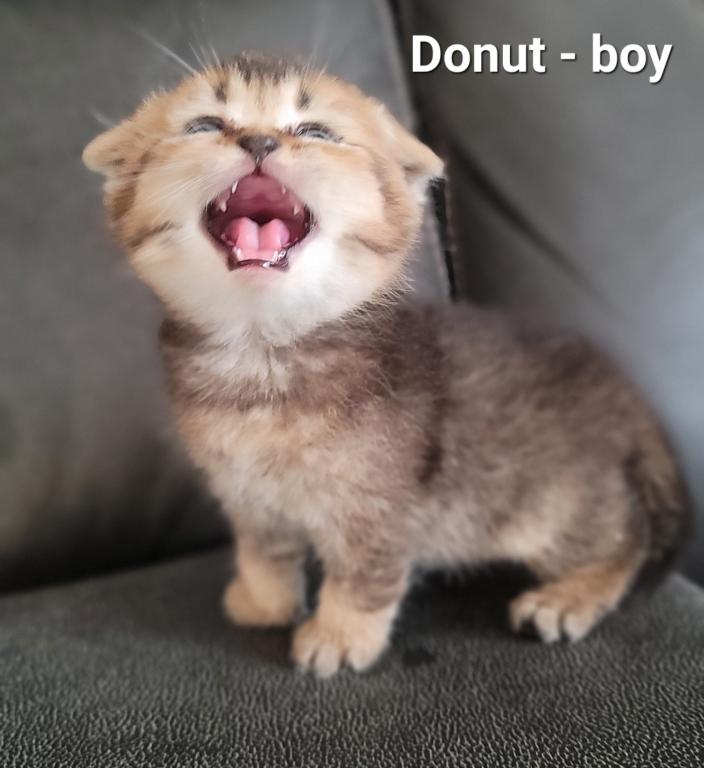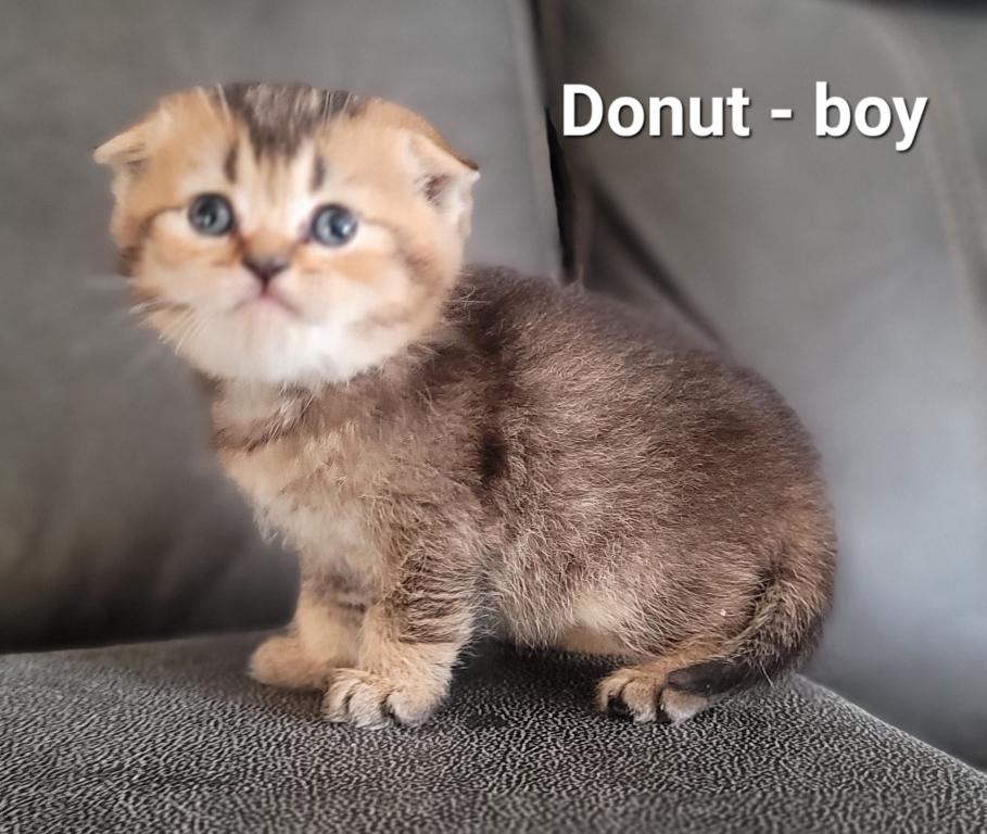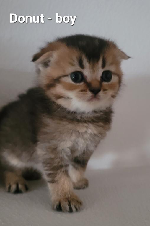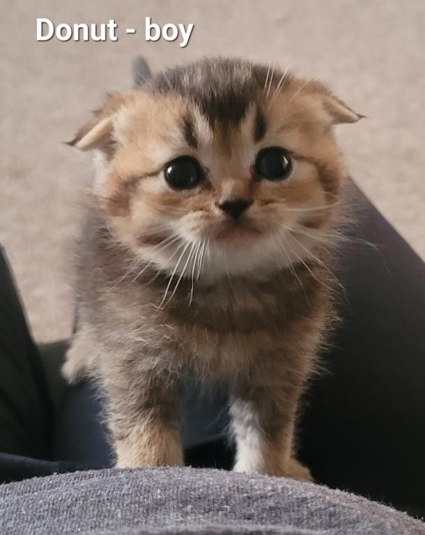 Donut is a Scottish Fold male kitten. He has a friendly personality. He comes with first set of shots and dewormers.