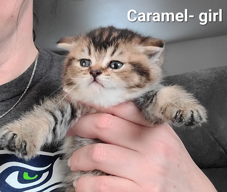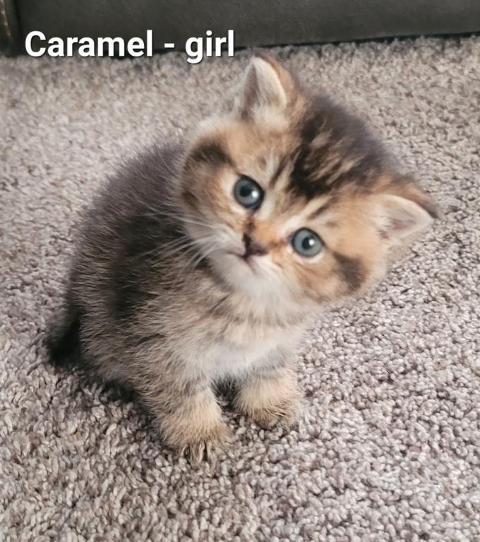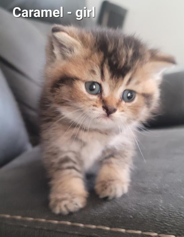 Caramel is a beautiful Scottish Straight female kitten. She has a sweet personality and very friendly. She comes with first shots, dewormers done.