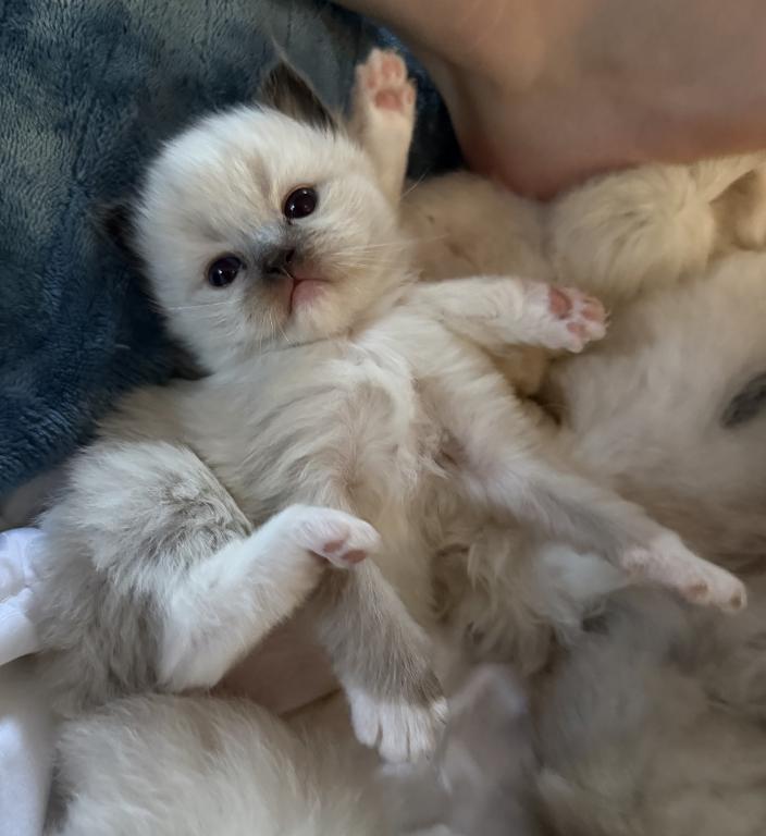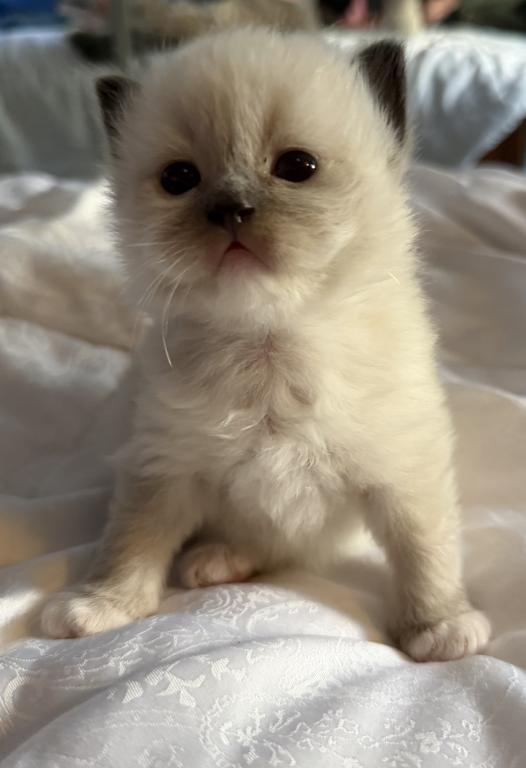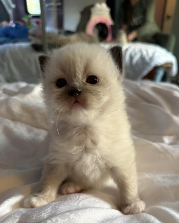 This absolutely precious mitted seal point Ragdoll boy from Kiki’s litter is the definition of soft, sweet, and soulful. With his velvety coat, deepening points, and those gentle, curious eyes, Cheddar has that classic Ragdoll look paired with a calm, affectionate nature.