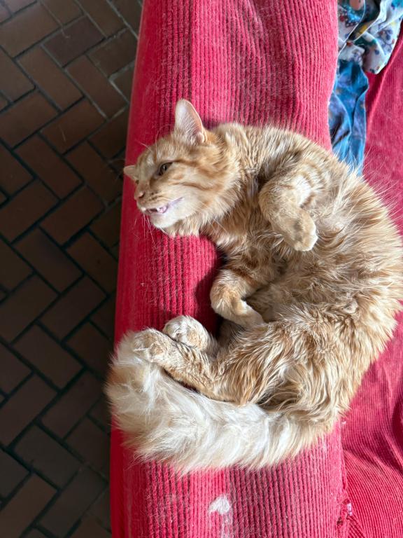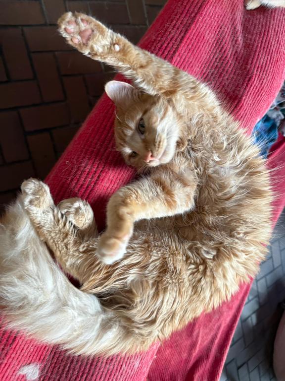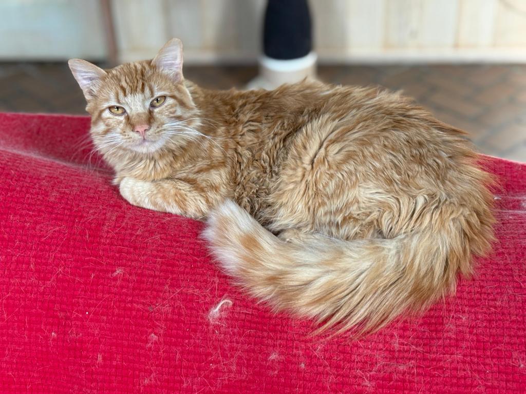 Orange, petite, longhaired male. Fully vaccinated with all three recommended. Not pediatricly altered so he could gain some heft.