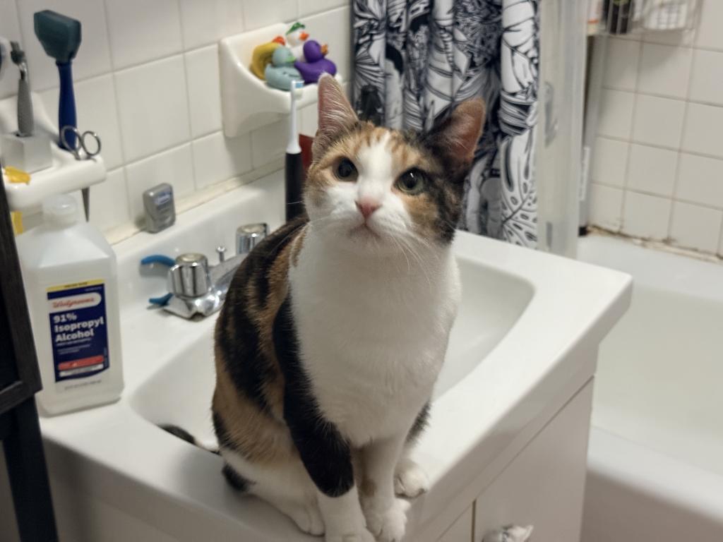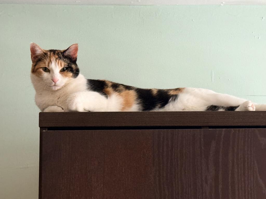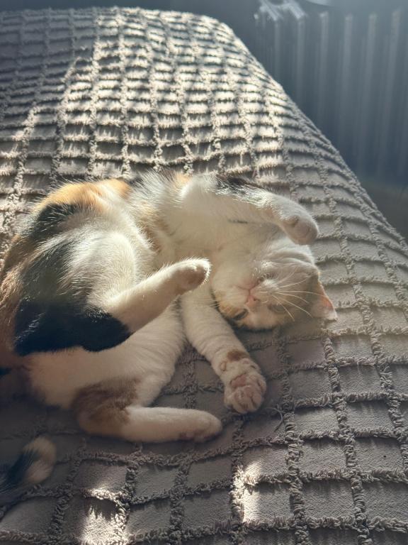 She came to us a feral cat and over the past several months has become more and more receptive to affection and love from us. She likes pets at her convenience and is very happy to just be with us. rolling up in her hammock while we watch TV and nap is one of her favorite things to do along with chasing her bird on a string toy.She's come so long and I wish we could keep her, but my 13 year old boy Kruger has heart issues and can't deal with further stress trying to adjust to a cat that isn't really interested in being friends with them.