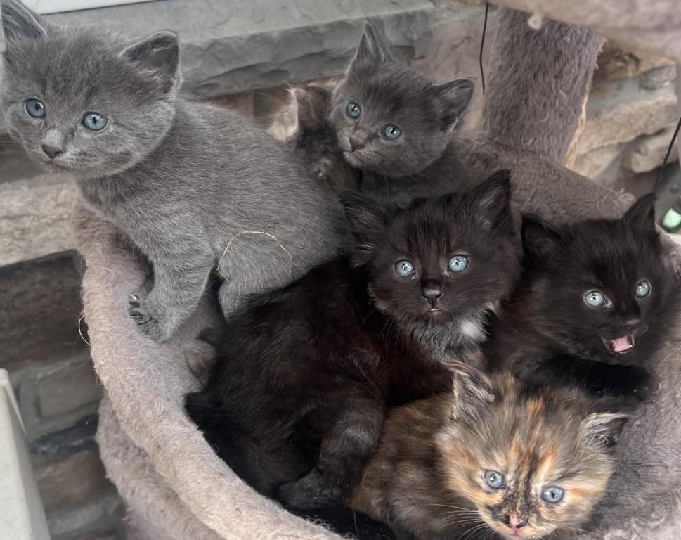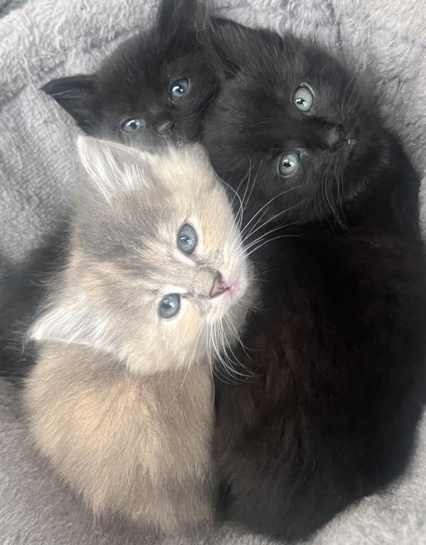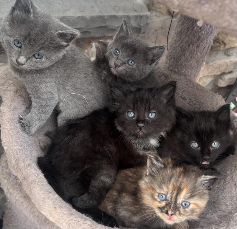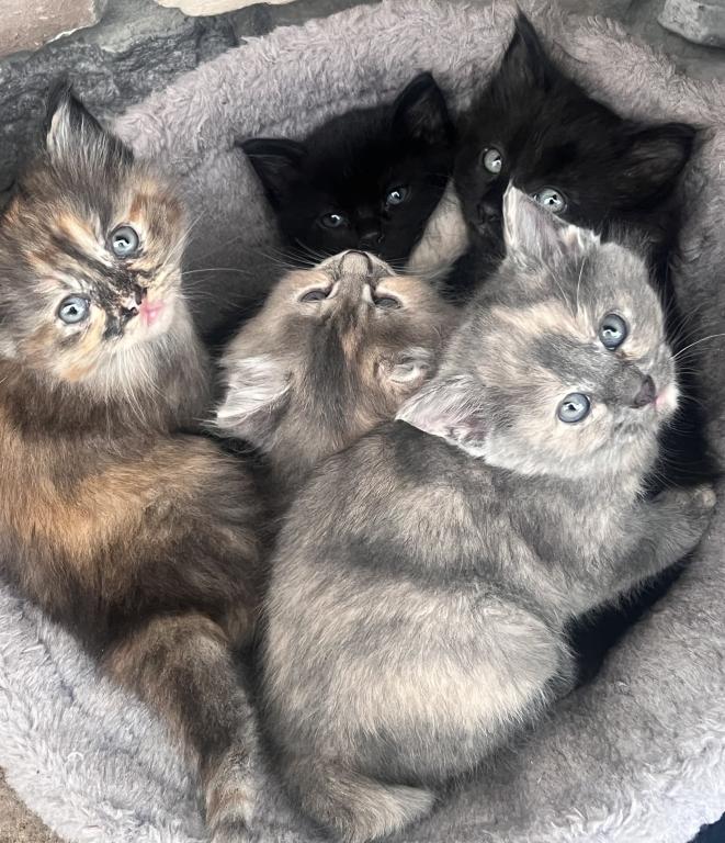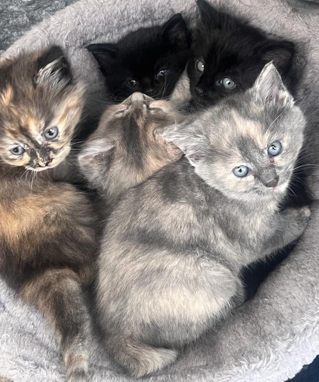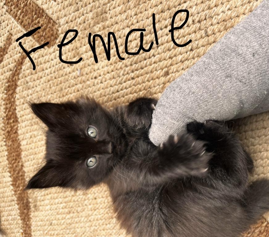 Here are 6 beautiful adventurous and freshly independent female kittens! This is a litter of 7 kittens with the black male kitten already having an adopter, so it’s just the 6 females looking for their forever home. Born on March 8 Sunday, they will be 7 weeks on April 26 and 8 weeks old on May 3. I will be on vacation from April 27-May 7 so I am looking for new homes for my fluff babies now. They eat solid food, are litter trained, playful, and some are more independent than others while others are more playful such as the black kitty. The rehoming fee of 200 ensures a loving home so the kitten is not abandoned but is loved and well taken care of, and the fee reflects the cost of food and time/care spent socializing with the kittens, bedding, toys, flea treatments etc. I am flexible on the rehoming fee for the 2 grey kittens that have shorter fur. The longer furs are mixed with Maine coon from their mixed main coon mom and we have 3 with unique orange colors and one solid black kitten with taint white highlights. Some of the girls are more fluffy than others while the grey ones do have shorter fur. They are not spayed as they are still under 8 weeks, no shots, and they are not dewormed. You can text or email me. We can’t wait to meet you!