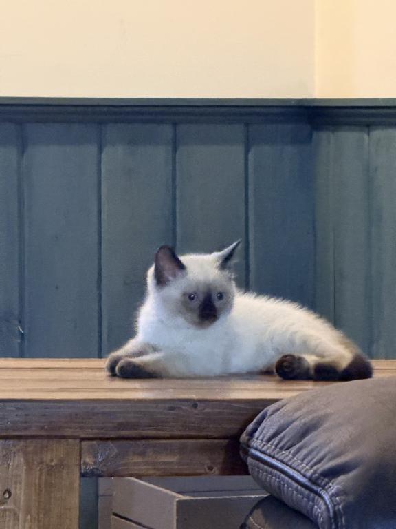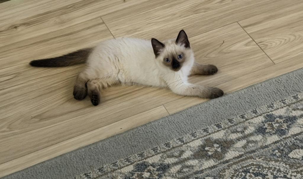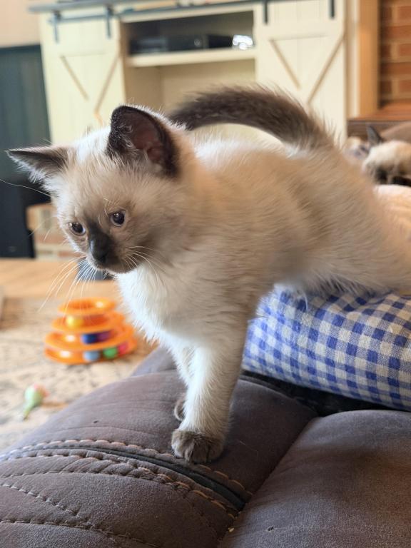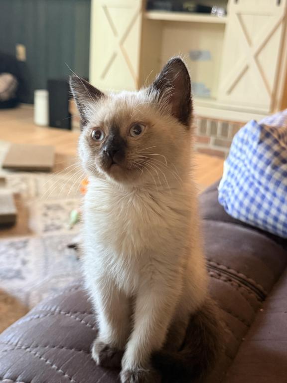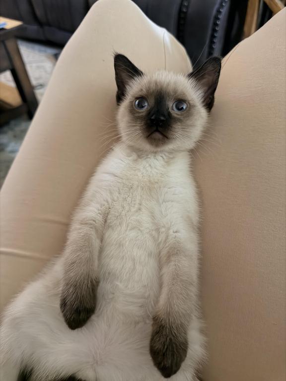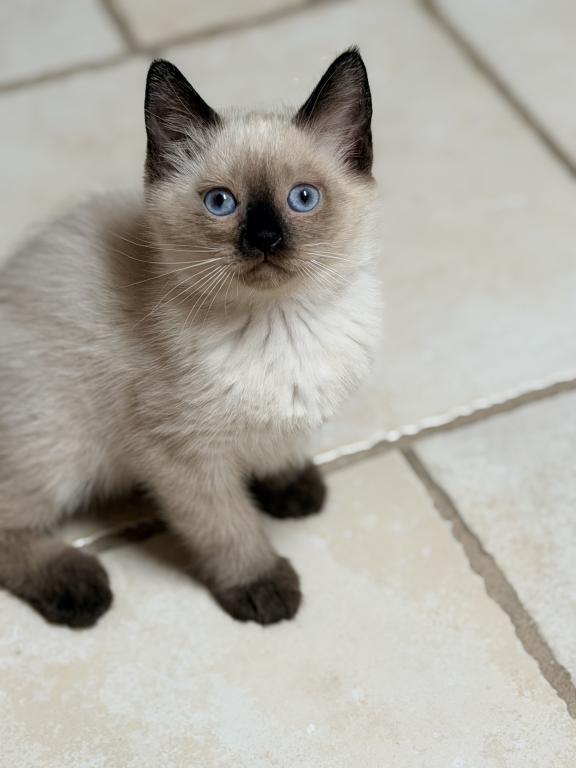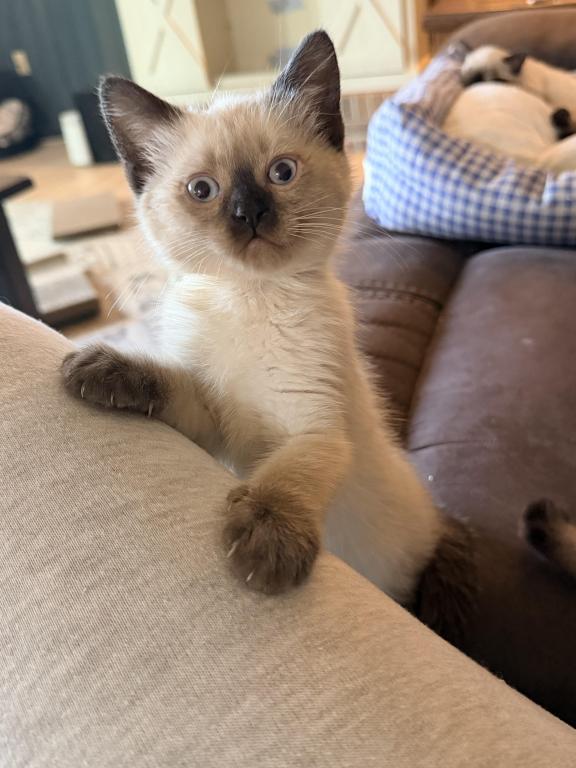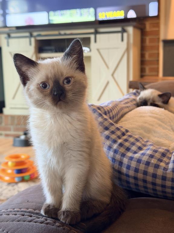 There are four applehead kittens-one boy and three beautiful girls-with stunning blue eyes, born to a seal-point mom and a seal-point dad. They're just as mischievous as their mom, and they've loved to play ever since they started moving around. *t We offer 15% off the second kitten when they're adopted together. I love seeing siblings stay with each other—it's so special when they get to grow up side by side. ✨