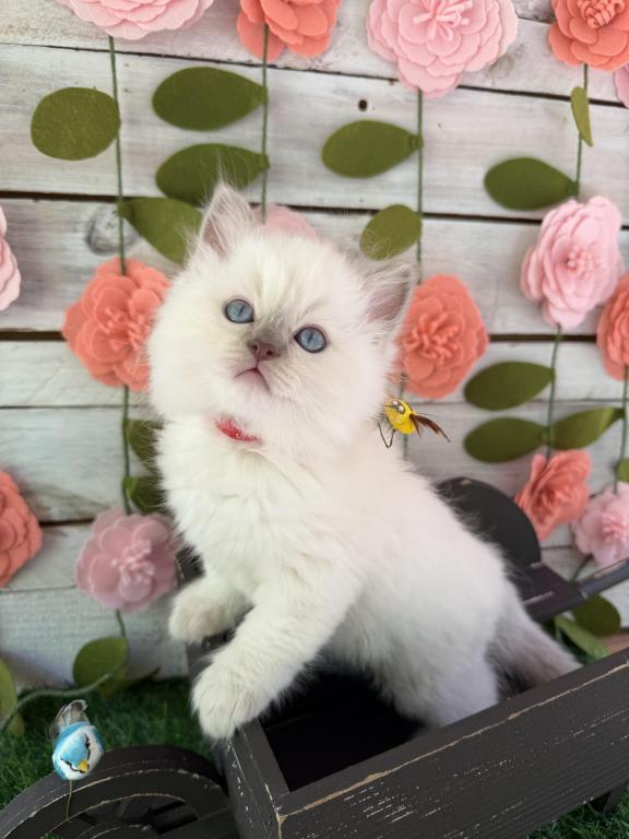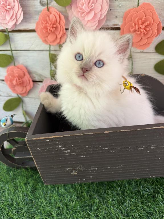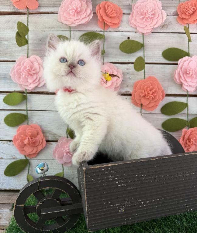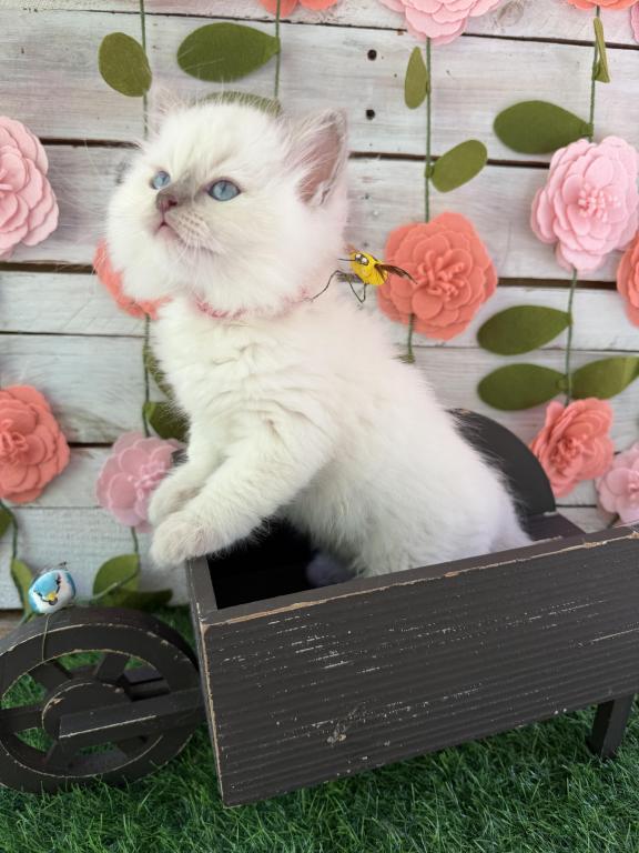 We have been blessed with a beautiful Cherubim Ragdoll litter! Blossom (Orange Collar ) is a Lilac point Mink Cherubim/Ragdoll. Dad is Thorn a lilac point Cherubim/Ragdoll and Mama is Peppermint, a Blue Point Cherubim/Ragdoll! He will be ready for his forever home in late May. Both parents are TICA registered. Kittens will come with Florida health certificate and 30 days of Trupanion insurance. Kittens are raised in our smoke free home with dogs and young children with plenty of socialization and enrichment. Please check out our Facebook page Sterling Sky’s Dollhouse or website below, thanks for browsing!