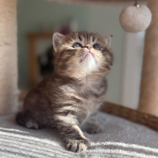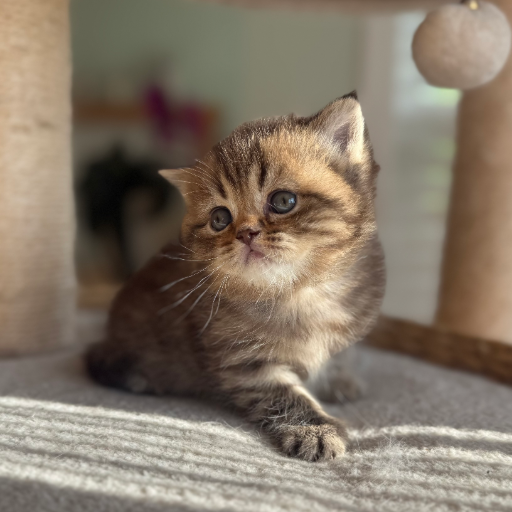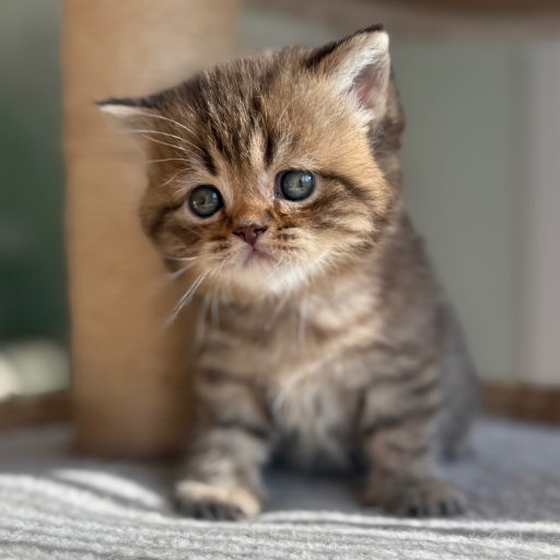 Persy is adorable chocolate golden tabby Scottish Straight male kitten. He is looking for his forever home. He has a beautiful warm golden coat with rich chocolate tabby markings, soft plush fur, and expressive round eyes that give him a sweet, gentle look. His ears are straight, perfectly complementing the classic Scottish Straight appearance.