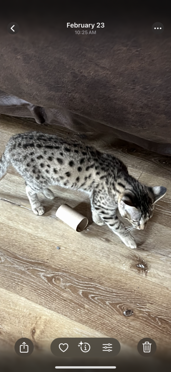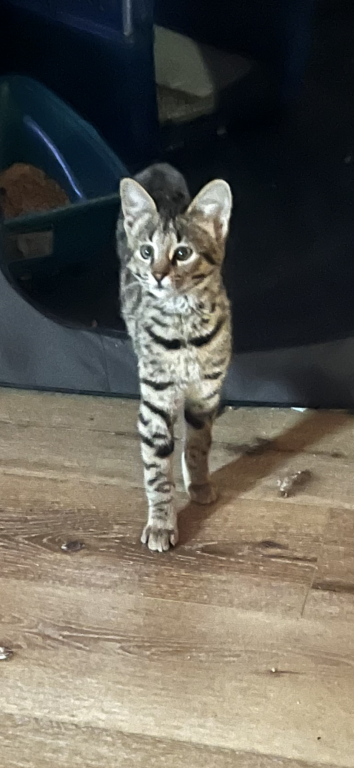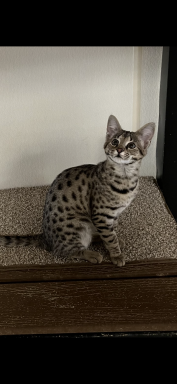 The Savannah girl is tall and long legged. She has beautiful markings and wonderful personality and is a sweetheart heart. Please check your local state laws for owning an F 2Savannah. Contact me at 937-248-3337 for more pictures and videos